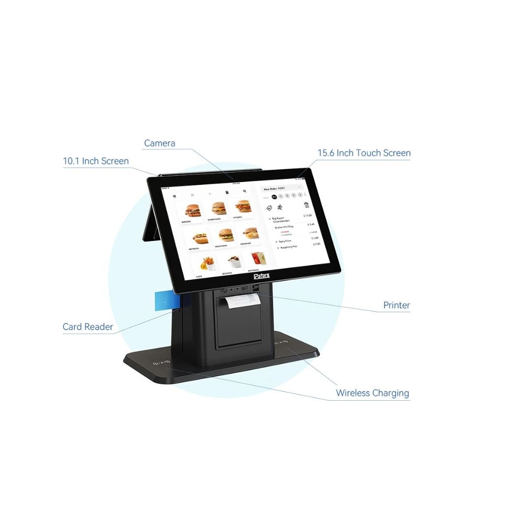- Integrated Peripherals: Includes a printer for small ticket printing, a card swiper, and wireless charging capabilities.