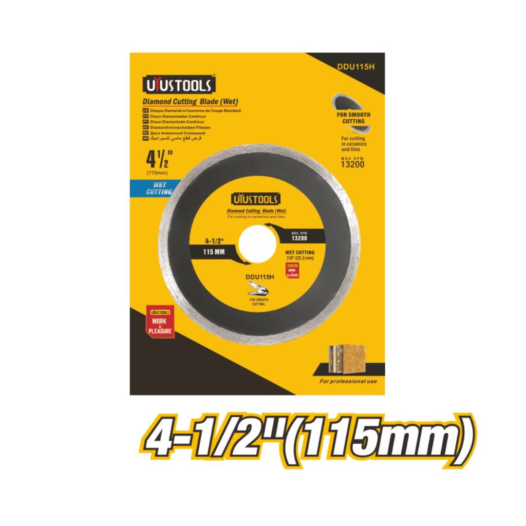 13200RPM Wet Diamond Cutting Disc Model ARL-DDU115H. This 4-1/2″ (115mm) diameter diamond cutting disc features a 7/8″ (22.2mm) arbor. It has a blade width of 5.2mm and a maximum operating speed of 13200RPM. This disc is designed for wet cutting of tile, stone, and similar brittle materials to provide clean and chip-free edges. It includes one reducing ring with a size of 3/4″ (19mm) for arbor size adjustment.