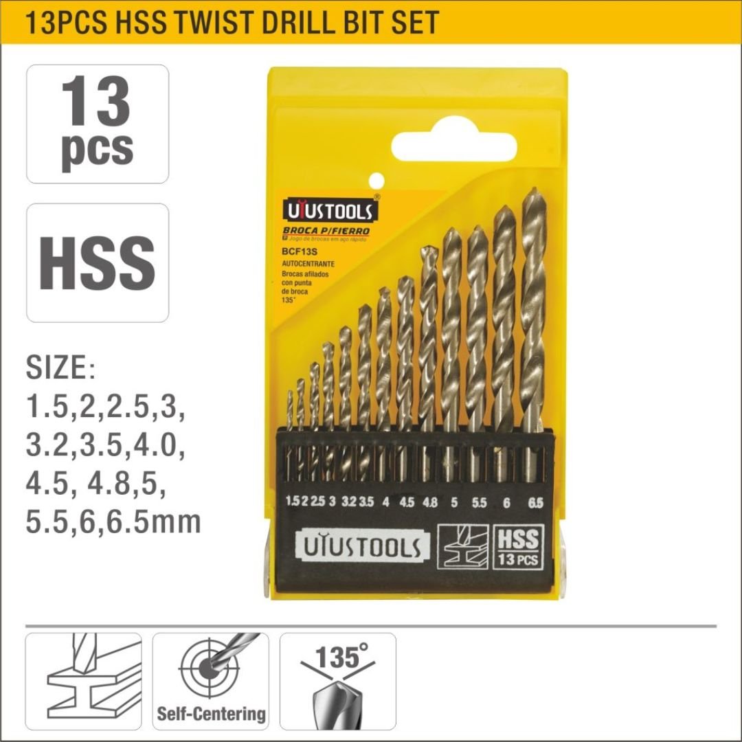 13pcs HSS Twist Drill Bit Set with 135° Split Point Model ARL-BCF13S.This set (Model ARL-BCF13S) includes 13 high-speed steel (HSS) twist drill bits designed for metal use. The set contains the following sizes: 1.5mm, 2mm, 2.5mm, 3mm, 3.2mm, 3.5mm, 4.0mm, 4.5mm, 4.8mm, 5mm, 5.5mm, 6mm, and 6.5mm. Each drill bit features a 135° split point for precise starting and reduced walking.