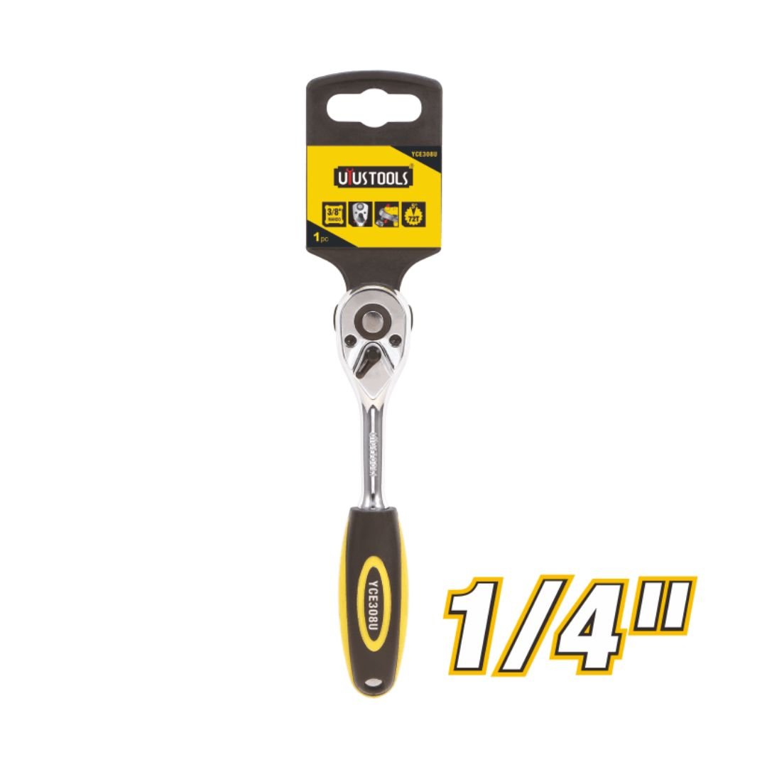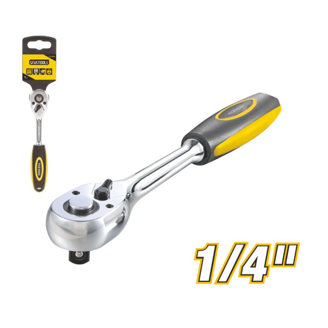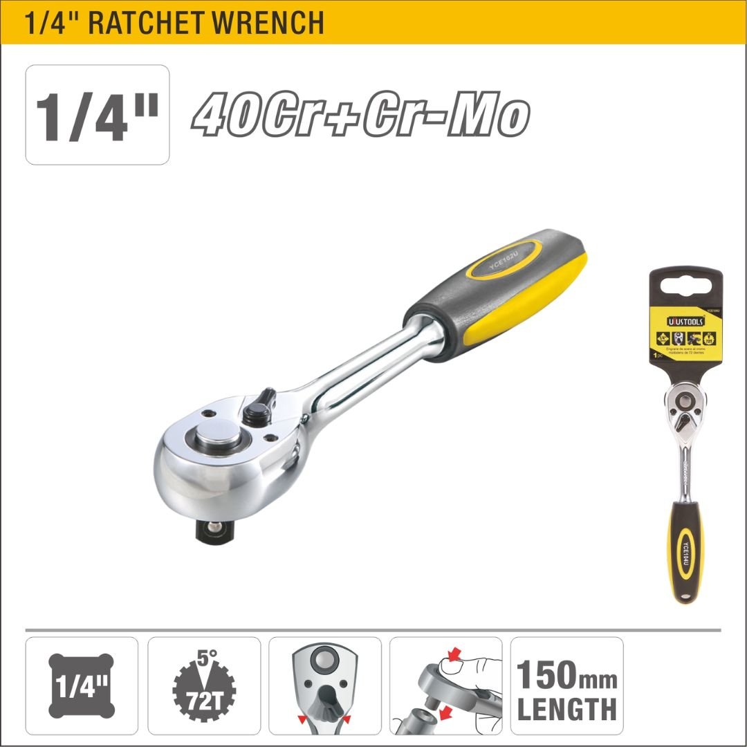 150mm Ratchet Ring Spanner (72T) with TPR+PP Handle Model ARL-YCE104U. This ratchet ring spanner has a size of 1/4″ and features a 72-tooth ratchet mechanism for fine-tuned and efficient fastening. It has a length of 150mm and is constructed from durable 40Cr+Cr-Mo steel. The handle is made with a soft TPR (Thermoplastic Rubber) and PP (Polypropylene) material for a comfortable and secure grip. The spanner undergoes heat treatment for increased strength and is chrome plated for enhanced corrosion resistance.