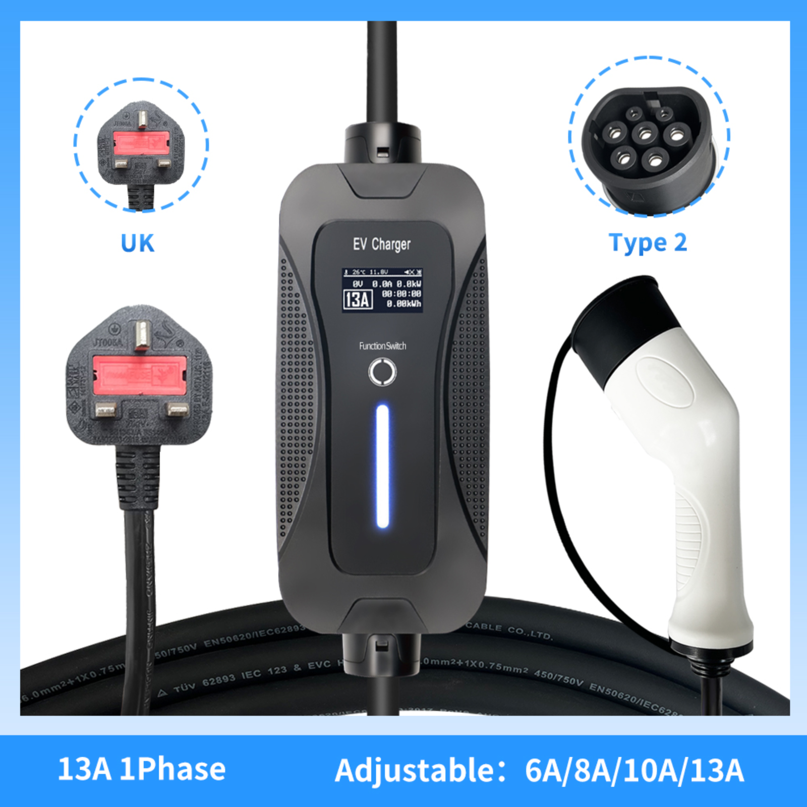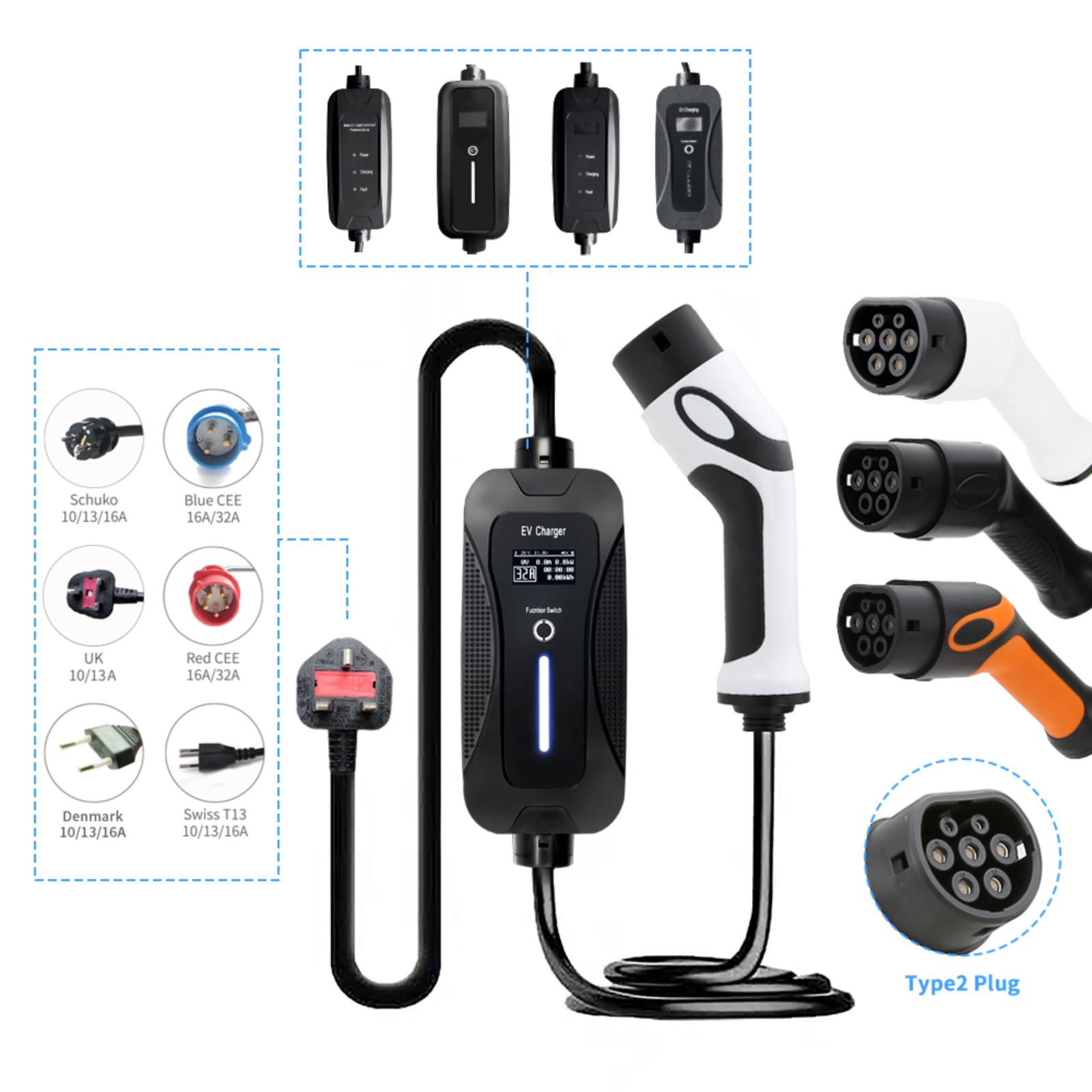 16A/32A Fast charging 32A Type2 Portable EV Charger These are simple models, divided into 2 kinds: LED Type and Standard Type, depending on how the Charger is with or without a screen. It comes with an LED display(Optional) that allows users to see the current charging status including charging time, voltage, current internal temperature, etc.