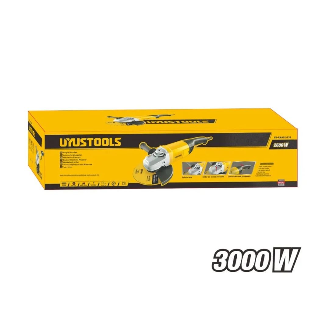 230mm Angle Grinder Model ARL-UY-AMA03-230. This angle grinder features a high-power motor to improve work efficiency and an auxiliary handle for easy holding. The spindle lock allows for easy disassembly and assembly of accessories. It is designed with high-efficiency heat dissipation and a protective fuselage. Comfortable soft grip handles ensure ease of use, and a grille-type air intake provides an open air duct.