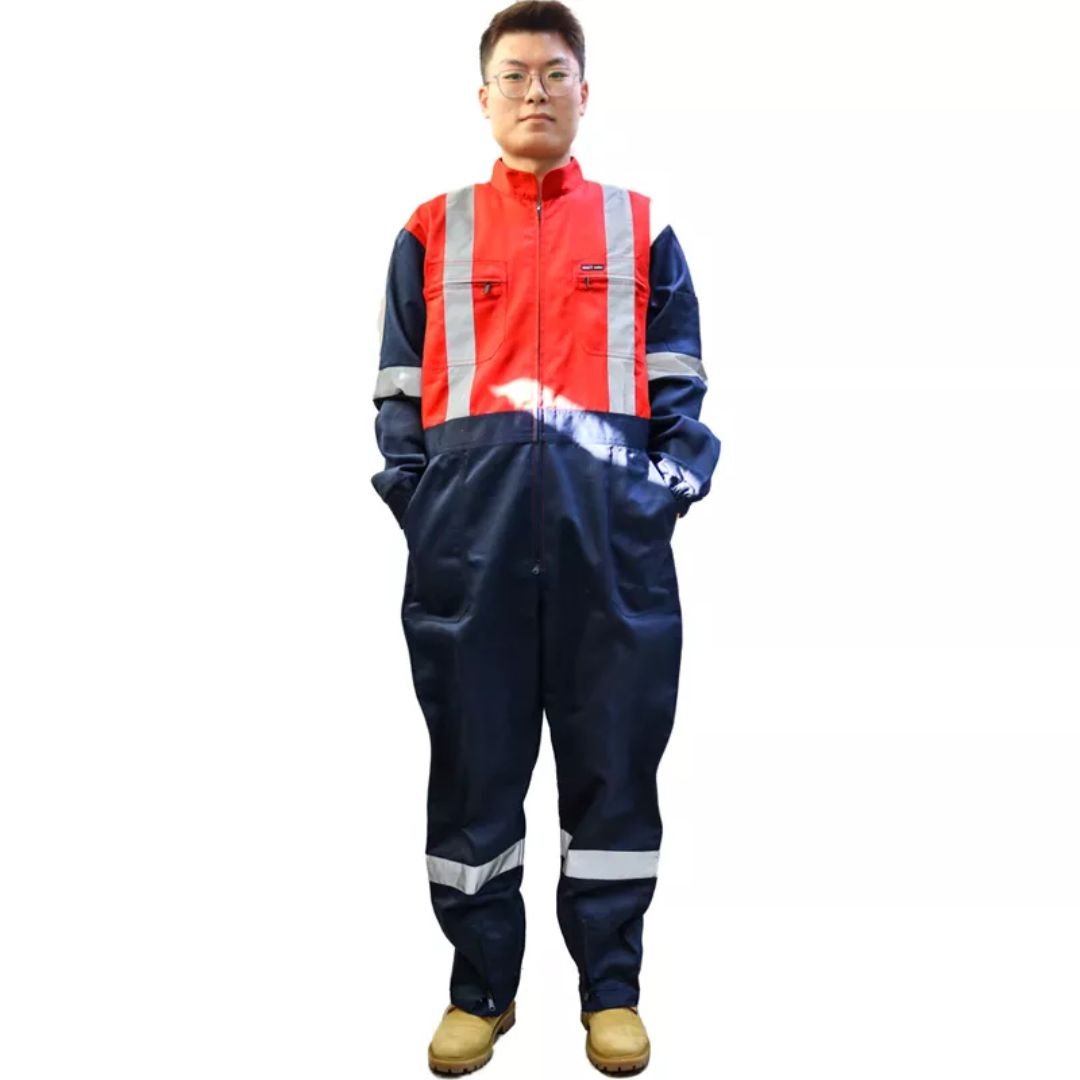 - Design Features: Action back, elasticized waistband in back, long zipper, two chest pockets with zipper, two back pockets, two side pockets without flaps on the trousers, one pocket in the left sleeve, high visibility polyester reflective tapes on the legs, sleeves, chest, and back.