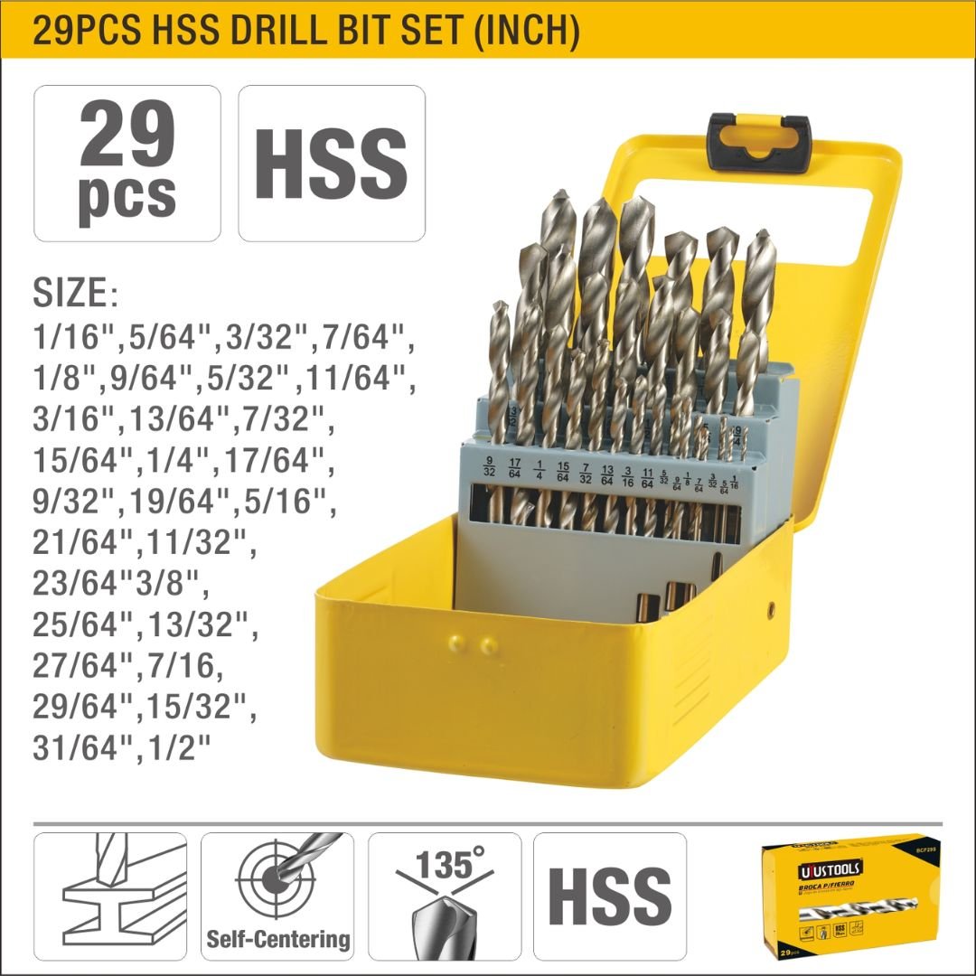 29pcs HSS Twist Drill Bit Set (Inch) with 135° Split Point Model ARL-BCF29S. This set (Model ARL-BCF29S) includes 29 high-speed steel (HSS) twist drill bits with inch尺寸, designed for metal use. The set contains the following sizes: 1/16″, 5/64″, 3/32″, 7/64″, 1/8″, 9/64″, 5/32″, 11/64″, 3/16″, 13/64″, 7/32″, 15/64″, 1/4″, 17/64″, 9/32″, 19/64″, 5/16″, 21/64″, 11/32″, 23/64″, 3/8″, 25/64″, 13/32″, 27/64″, 7/16″, 29/64″, 15/32″, 31/64″, and 1/2″. Each drill bit features a 135° split point for precise starting and reduced walking.