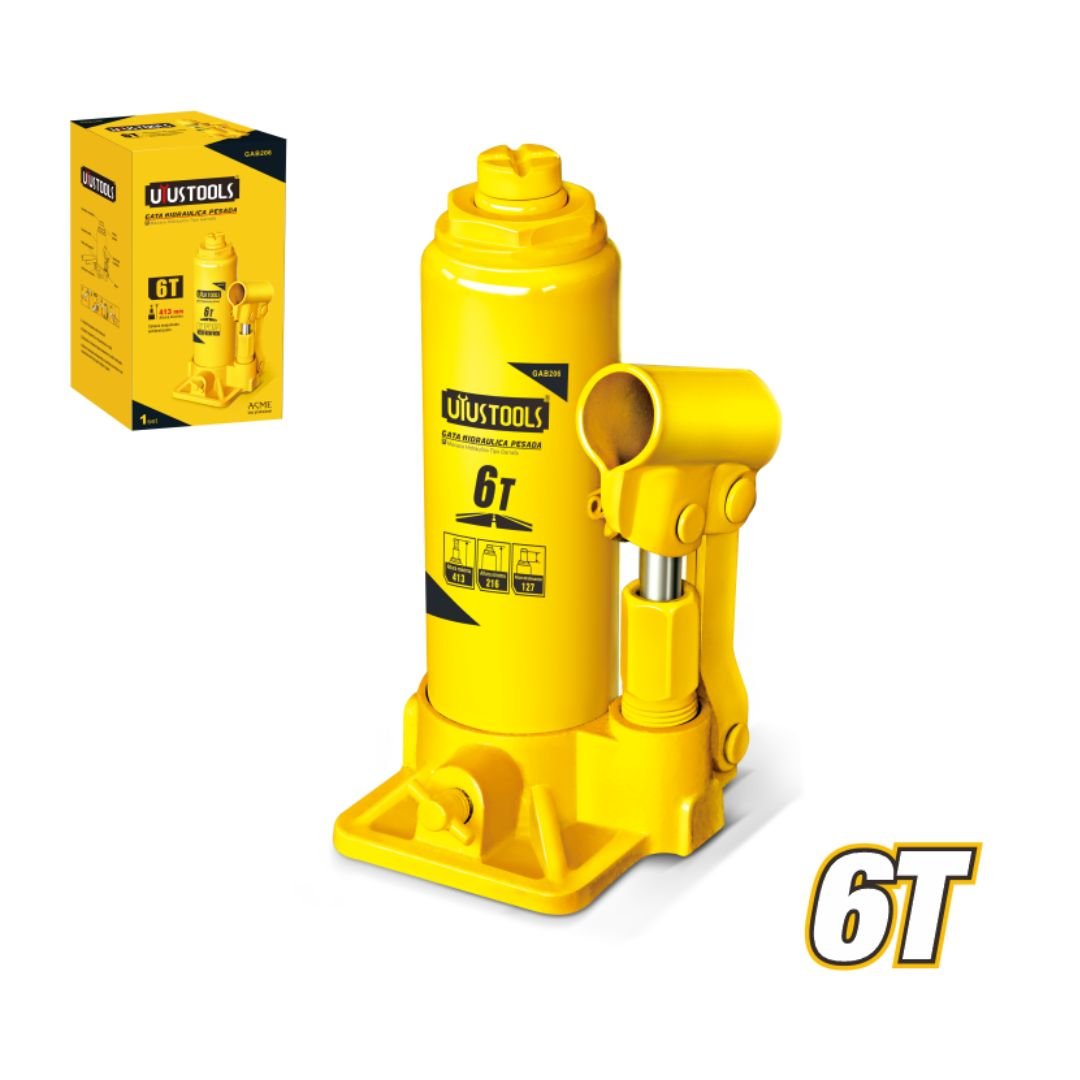 6 Ton Heavy Duty Bottle Jack (216-413mm Lift Height) Model ARL-GAB206. This hydraulic bottle jack has a lifting capacity of 6 tons. It offers a maximum height of 413mm and a minimum height of 216mm, providing a substantial lifting range for heavy-duty applications. It also features an adjustable height of 70mm and a lifting height of 127mm. The jack is equipped with a machined head for secure lifting. It has passed both dynamic and static load tests according to ASME standards, ensuring reliable and safe operation.