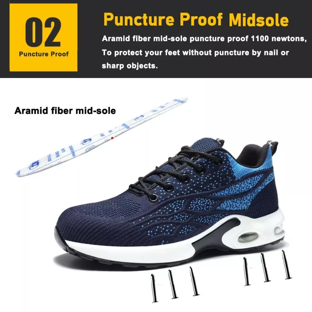 - Sole: Air-cushioned PU, slip-resistant, and meets CE EN ISO 20345:2022 Non-Slip Testing Standards. Also resistant to oil, petrol, and chemicals.