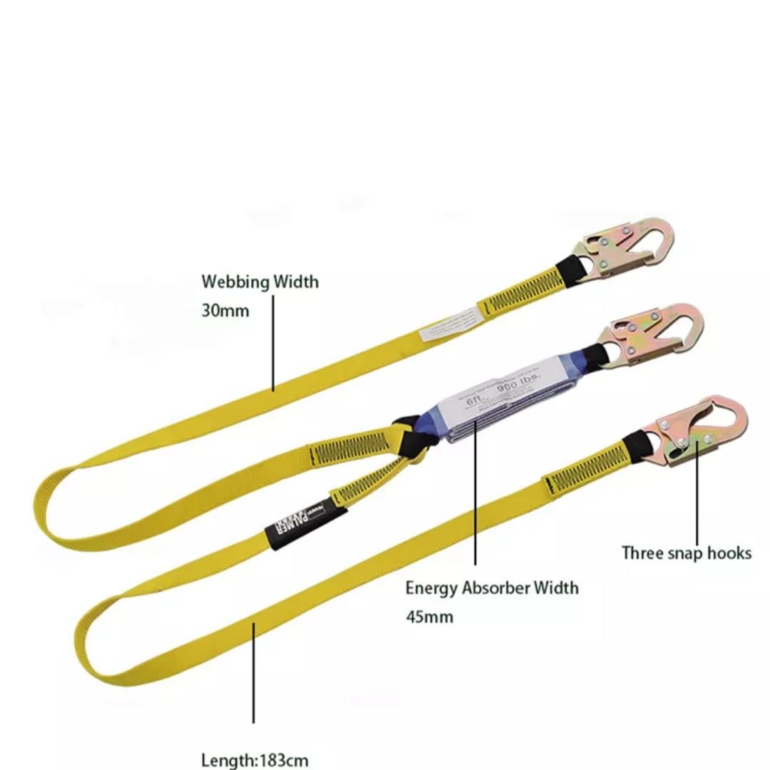 The ANSI Z359.13 Certified Polyester Webbing Safety Energy Absorber Lanyard ARL-HN29 is a crucial safety component designed to limit fall impact forces. Constructed with durable yellow polyester webbing (30 mm width), it features a 45 mm wide energy absorber. This lanyard has a maximum webbing length of 1830 mm and is equipped with three snap hooks and one alloy steel carabiner for secure connections. Meeting ANSI Z359.13-2013 standards, it provides a reliable high-strength shock-absorbing solution for various work-at-height applications.