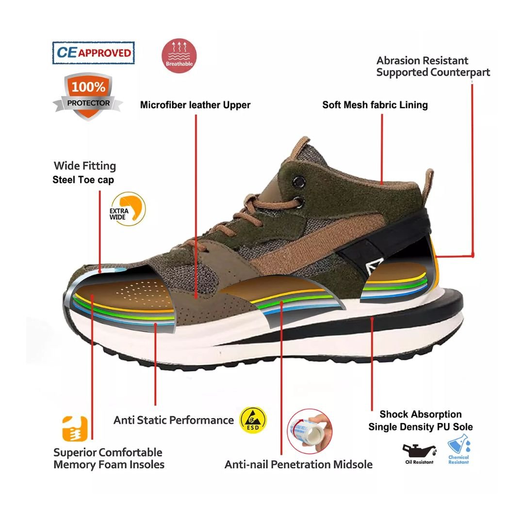 - Toe cap & mid sole: Steel toe cap (impact resistant 200 joules), Aramid fiber mid-plate (puncture resistant 1100 newtons)