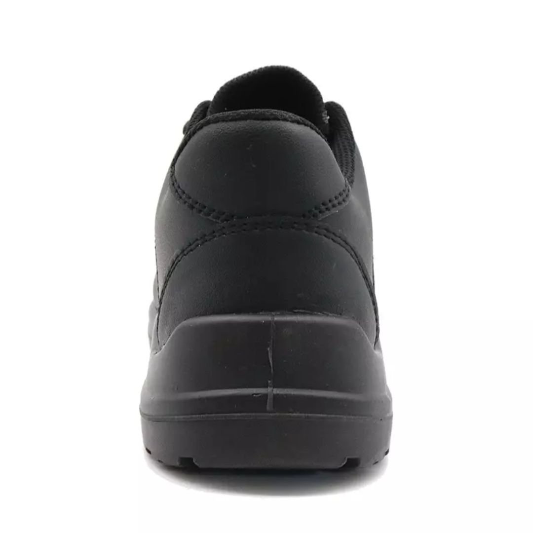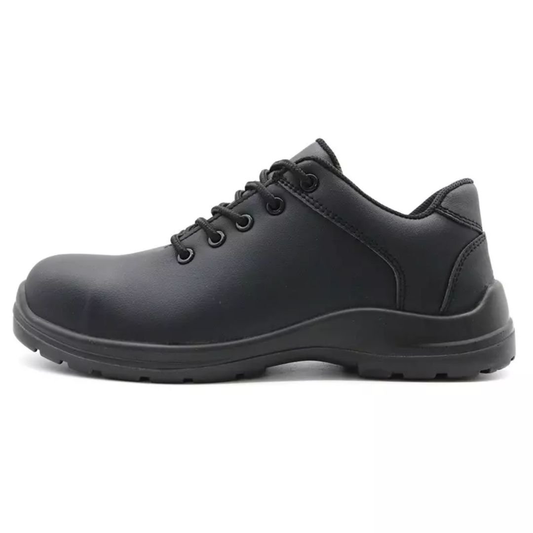 The Black Microfiber Leather Kitchen Safety Shoes for Chefs ARL-TM084-1 are injection-moulded, low-ankle, lace-up safety footwear specifically designed for professionals in the food industry, including chefs, restaurant staff, and hotel workers. These shoes prioritize exceptional slip resistance and hygiene, along with critical safety features. The upper is made from microfiber leather, offering comfort, high flexibility, and resistance to dust and wind, while also being easy to clean. The PU sole with anti-skid rubber provides superior slip-resistance and meets CE EN ISO 20345:2022 Non-Slip Testing Standards. For robust yet lightweight protection, the shoes feature a fiberglass toe cap for impact resistance and an aramid fiber midsole for puncture protection, both complying with CE EN ISO 20345 S1-P SRC standards (indicating anti-static properties and puncture resistance). A soft air mesh fabric lining and a removable metatomical HI-POLY (or EVA) footbed ensure long-lasting underfoot support and comfort.