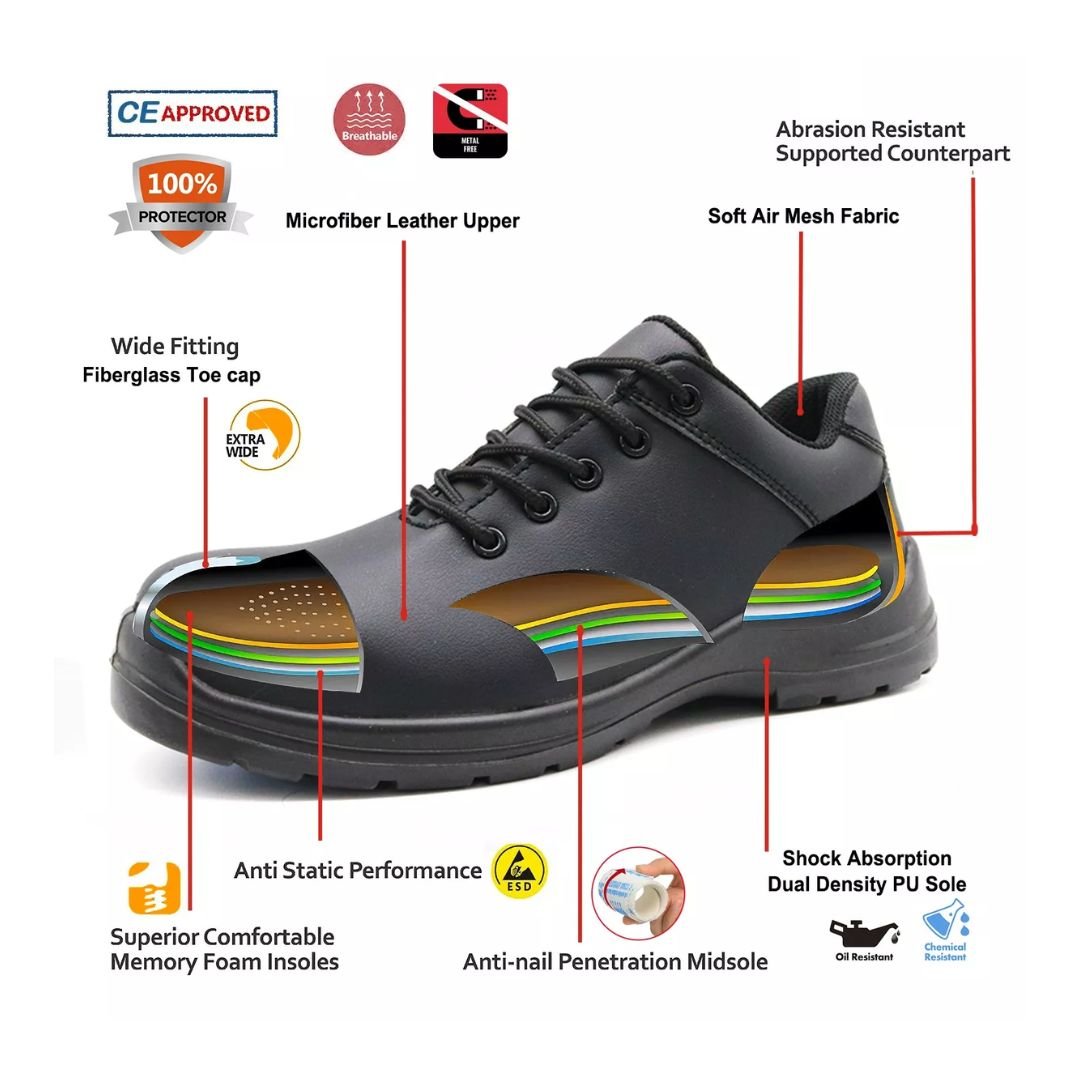 • Toe Cap: Fiberglass toe cap for impact resistance, meeting CE standards.