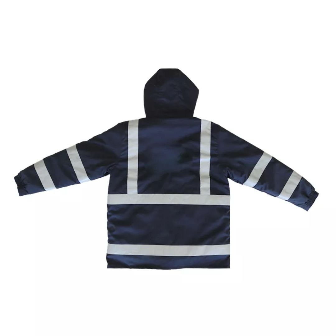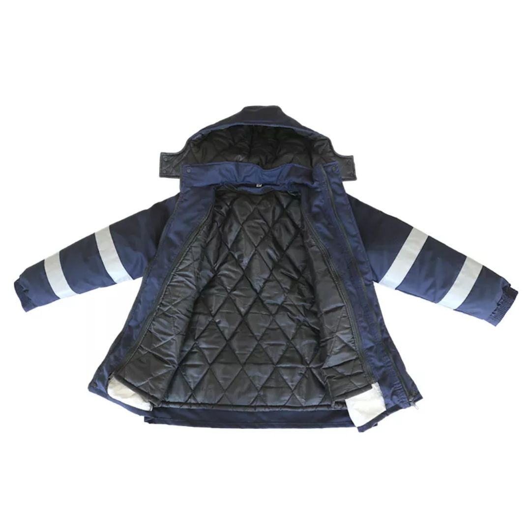 Cold Storage Hi-Vis Reflective Winter Jacket Model ARL-UM35. This robust one-piece winter jacket is specifically designed to provide excellent cold protection and warmth for individuals working in cold storage environments or engaging in outdoor work during winter. Constructed from a durable polyester-cotton blend, it offers a balance of comfort and resilience. The jacket features high-visibility reflective elements to enhance safety in low-light conditions. It is available in a practical navy blue color and a range of sizes from M to 4XL to ensure a comfortable fit for various body types. This jacket is a reliable choice for staying warm and visible in demanding cold conditions.