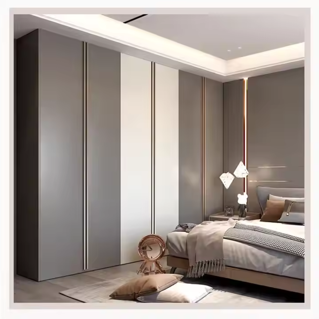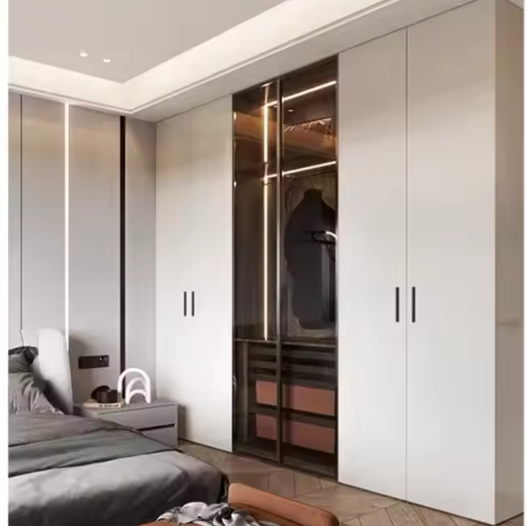 Customizable Modern Bedroom Furniture ARL-STWD-06. The ARL-STWD-06 offers a modern and highly customizable wardrobe, designed to provide efficient hanging rod and drawer storage for your bedroom. This versatile cloth organizer is built with a focus on contemporary aesthetics and practical functionality. Crafted from durable wooden materials for both its overall construction and door panels, it ensures a robust and long-lasting storage solution. Equipped with soft-close hinges for smooth and quiet operation, and available with multiple drawer options, this wardrobe is an ideal addition to any modern bedroom or storage area.