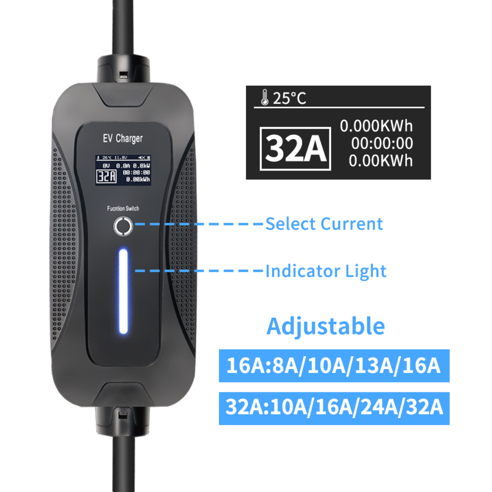 Fast charging 32A GB/T Portable EV Charger 16A/32A These are charging boxes with LED screen, which displays the ongoing current, voltage, and other charging data. If there is a fault, it will be displayed on the screen. The charging current can be adjusted as well.