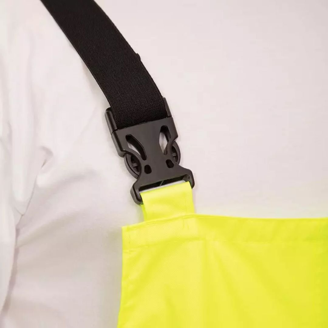 - Design Features: Hi-vis fluorescent color, 2 inch silver reflective tape, stitched and taped sealed seams, snap fly front, heavy-duty suspenders with quick release buckles and crossover, hook and loop take-up straps on leg cuffs, take-up snaps on the waist, polyurethane on 300D polyester fabric.