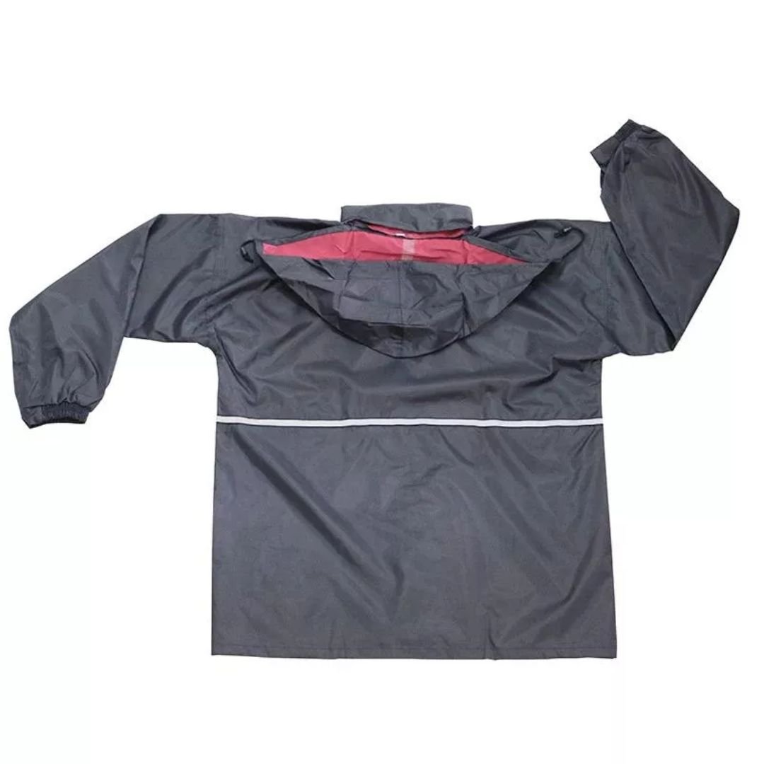 - Design: Attached hood with drawstring closure, Front with long zipper, Raglan shoulder design for ease of movement, Silver reflective tape on the shoulders, adjustable nylon buckle on sleeve cuffs, Basic wide leg trouser design with Elastic waist and two pockets