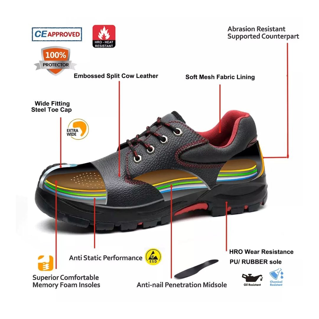 The HRO Rubber Sole Steel Toe Work Safety Shoes ARL-TM3323 are robust low-cut safety shoes designed for demanding industrial environments requiring high heat resistance, such as the oil and gas industry, oil fields, and mining. Constructed with an injection-moulded method, these lace-up shoes feature an upper made from durable embossed split cow leather. The sole is a combination of PU & natural rubber, offering excellent slip resistance, & crucially, HRO (Heat Resistant Outsole) properties, capable of resisting high temperatures. For enhanced comfort, the lining is made of soft mesh fabric, & the insoles are moulded HI-POLY coated with mesh fabric. These safety shoes are equipped with a steel toe cap & a steel mid-sole, meeting CE EN ISO 20345 SB-P SRC standards. These shoes are ideal for construction sites, industrial settings, mining, oil & gas operations, & other areas where robust foot protection against multiple hazards, including heat, is essential.