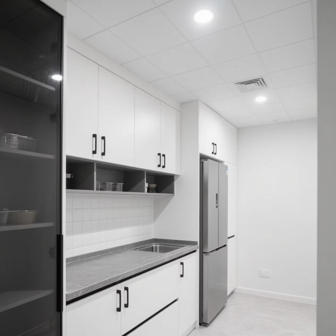 Modern White Modular Kitchen Cabinets with Black Handles Open Shelving ARL-C-004