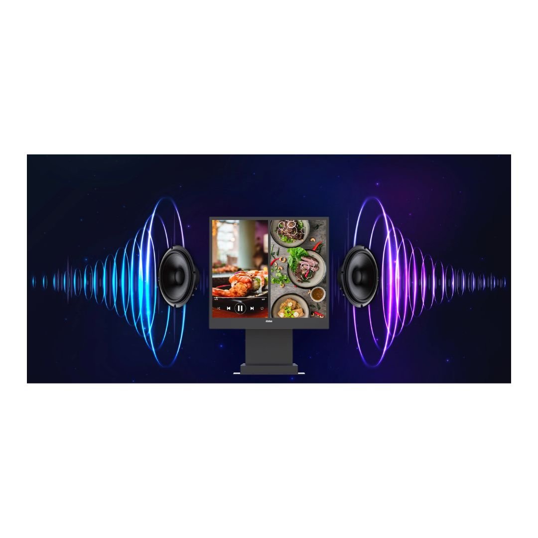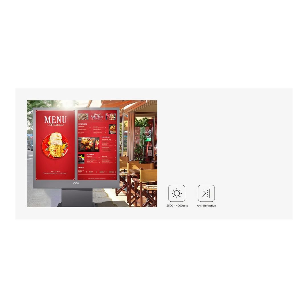 Outdoor Digital Menu Boards 55 inch. This outdoor double-sided digital advertising display is ideally suited for the food service sector, seamlessly merging high-definition visuals, top-notch safety features, and superior weather resistance. With a brightness of 2000-3500 nits and large dual screens, it ensures that digital menus and food images remain clearly visible even in direct sunlight. Equipped with laminated explosion-proof glass and IP65-rated protection, it offers enhanced impact resistance and safety, designed to withstand harsh outdoor conditions to ensure device stability and longevity. It supports long-term operation across a wide temperature range, from -20°C to 75°C, and features automatic brightness control. The display also includes built-in 2x10W speakers for an immersive audio-visual experience.