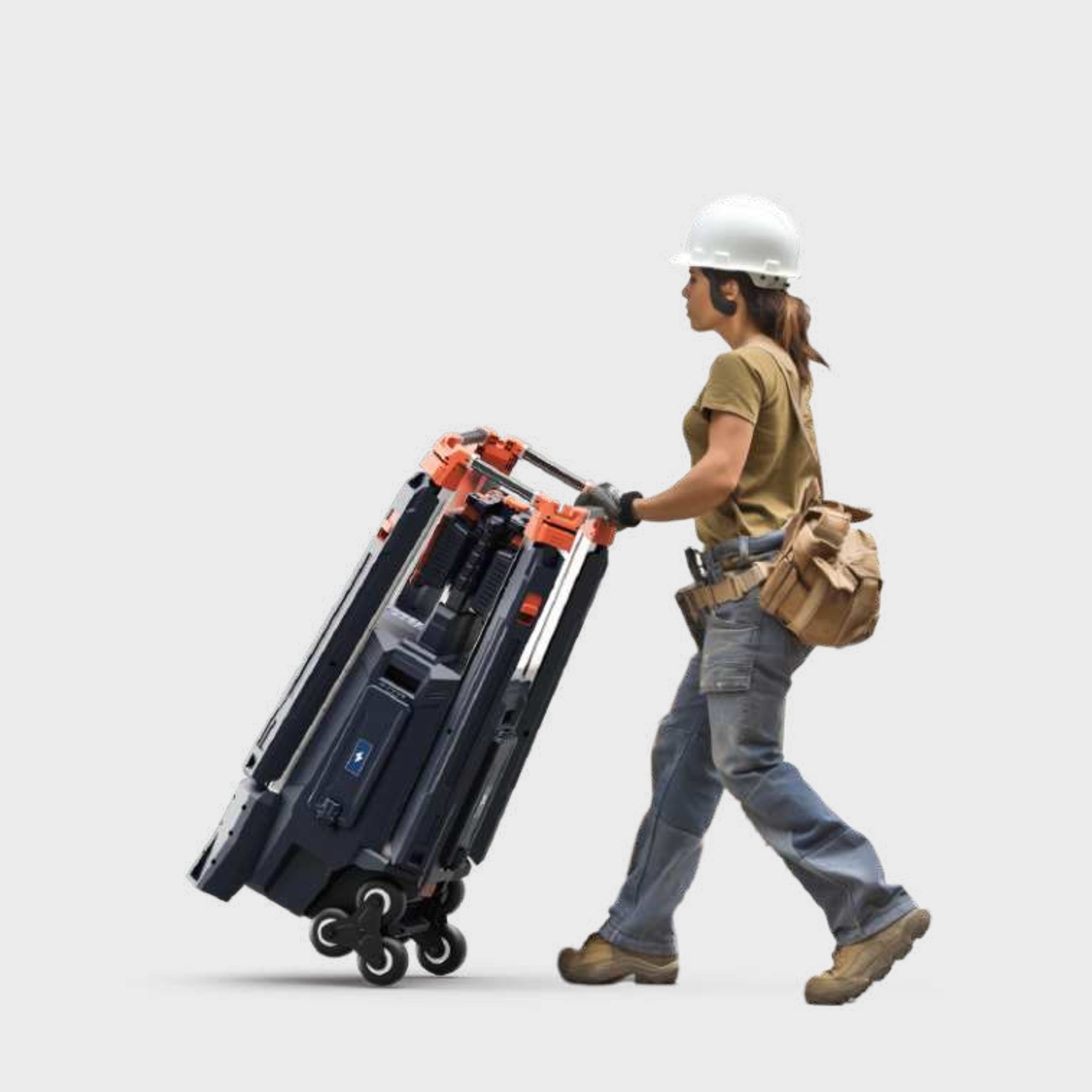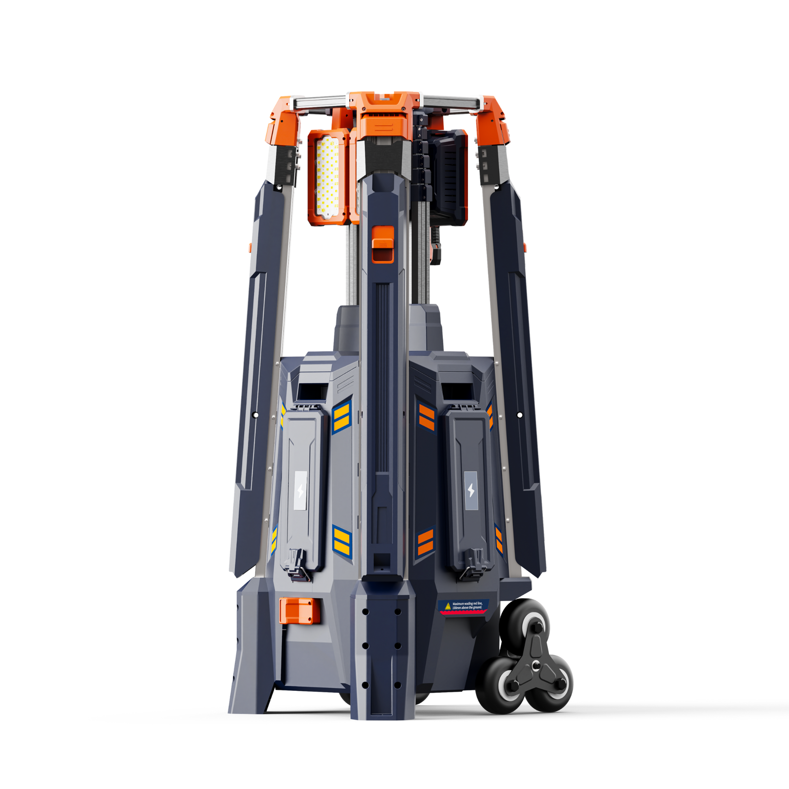 The light tower has adjustable lamp heads for versatile lighting, including unidirectional, multi-point, and 360° coverage. It is equipped with multi-level self-locking support legs to adapt to various terrains and has a coaxial 3-wheel design for easy one-person transport.