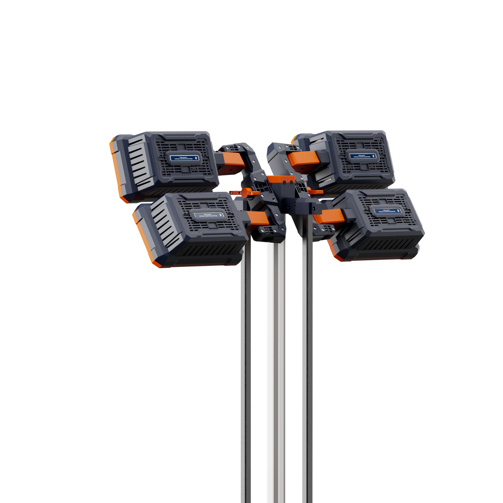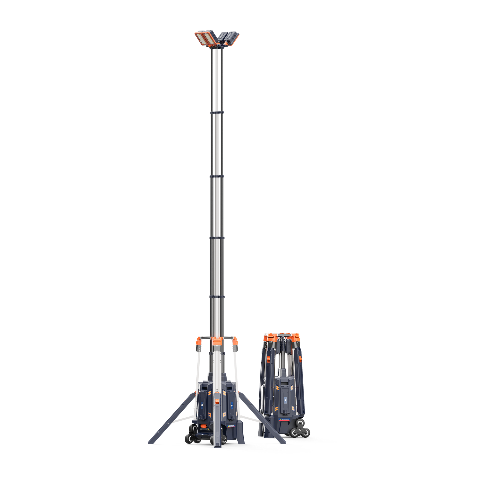 Optional accessories are available to expand the power supply options. The light tower is designed for one-person operation, with a weight of 50kg (4.2m) or 52kg (5.3m) excluding the battery pack. It is suitable for various applications, including construction, mining, emergency response, sports events, and firefighting.