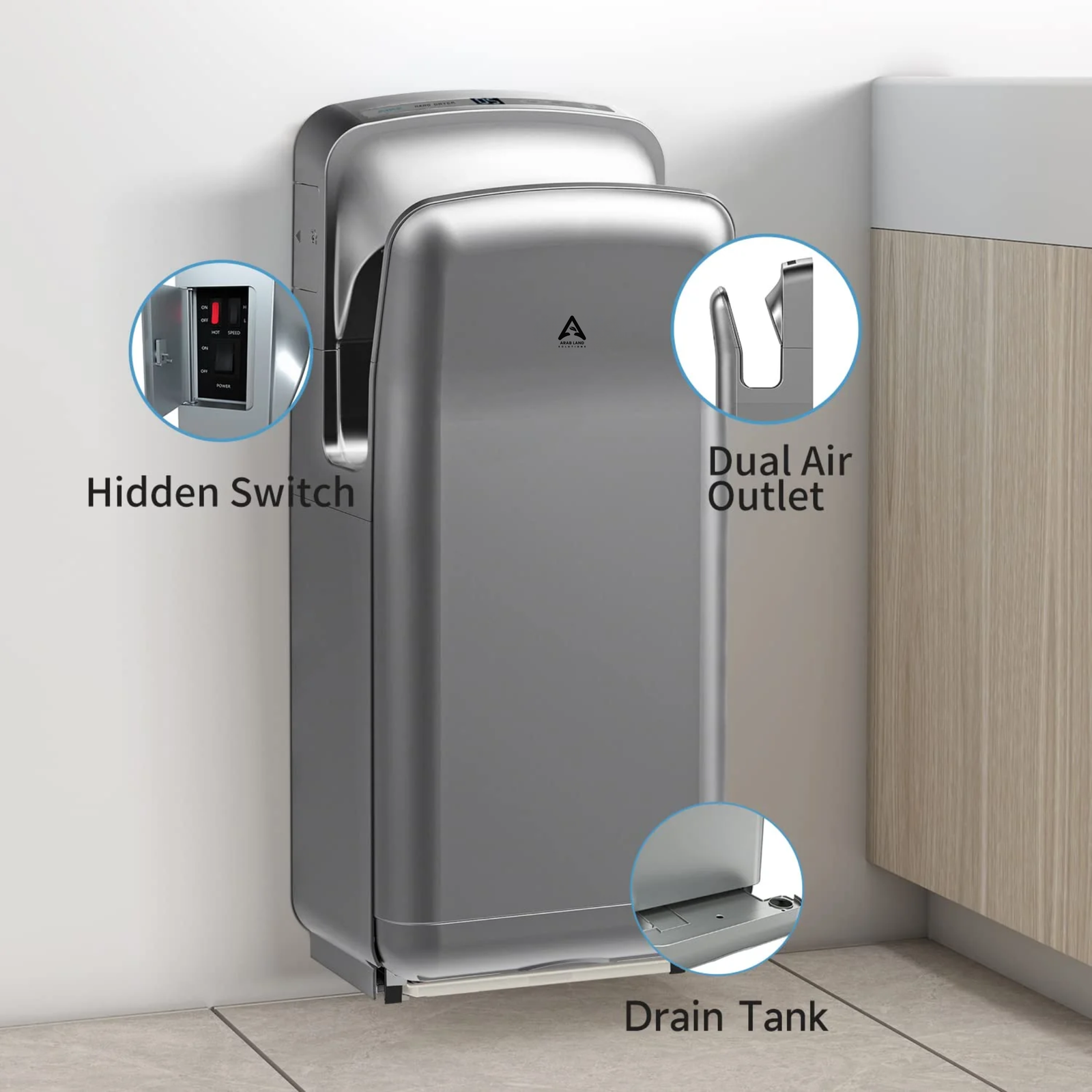 The Premium Hand Dryer With LED Timing ARL-AK2005H offers powerful and hygienic hand drying for commercial bathrooms. With a fast drying time, HEPA filtration, and adjustable settings, it provides a superior user experience.