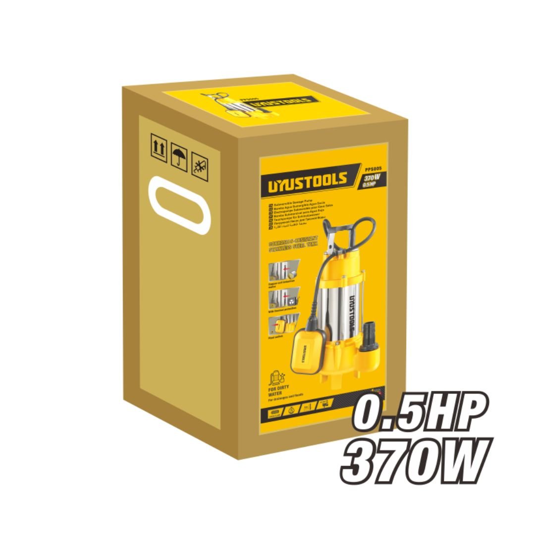 0.5HP Submersible Sewage Pump Model ARL-PPS005. This submersible pump has an input power of 370W (0.5HP) and is designed for both 110-120V/60Hz and 220-240V/50-60Hz power systems. It offers a maximum flow rate of 191L/min and a discharge pipe diameter of 1.25″, with a maximum head of 8m. This pump is suitable for handling sewage and wastewater in residential or light commercial applications.