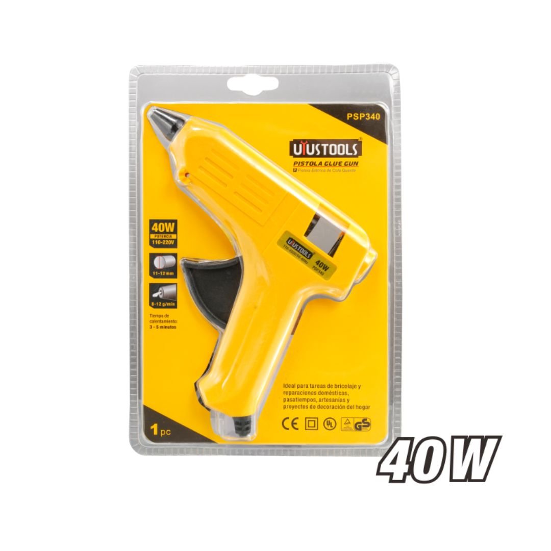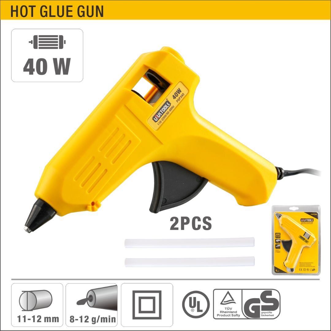 11.2mm Hot Glue Gun Model ARL-PSP340. This hot glue gun has a gluing capacity of 8-12g/min and is designed for use with 11.2mm glue sticks. It comes with 2pcs 100mm glue sticks.
