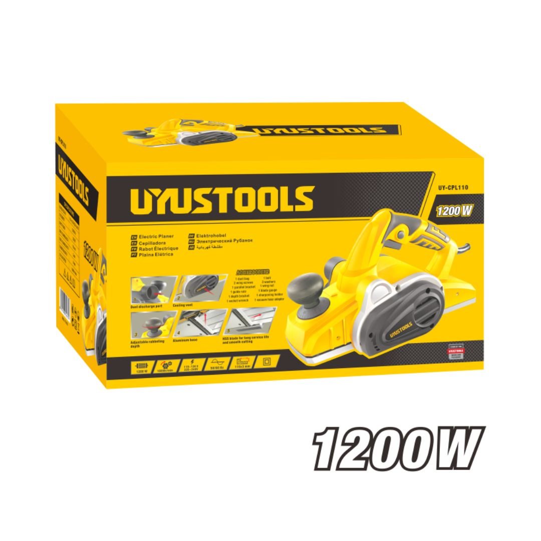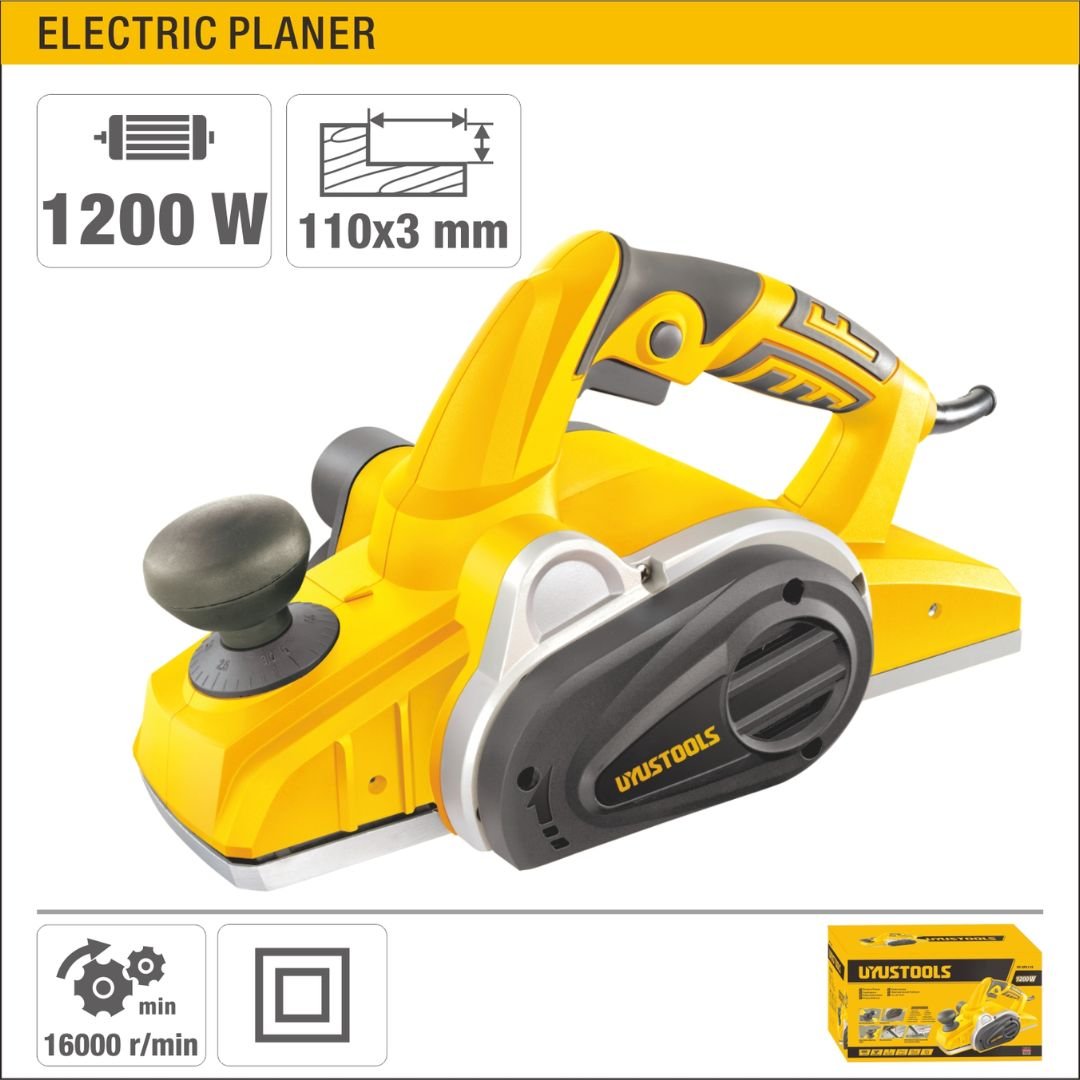 110mm Electric Planer Model ARL-UY-CPL110. This electric planer features a self-cooling belt system and a rabbeting depth of 14mm. It offers a planning width of 110mm and a planning depth of 3mm.