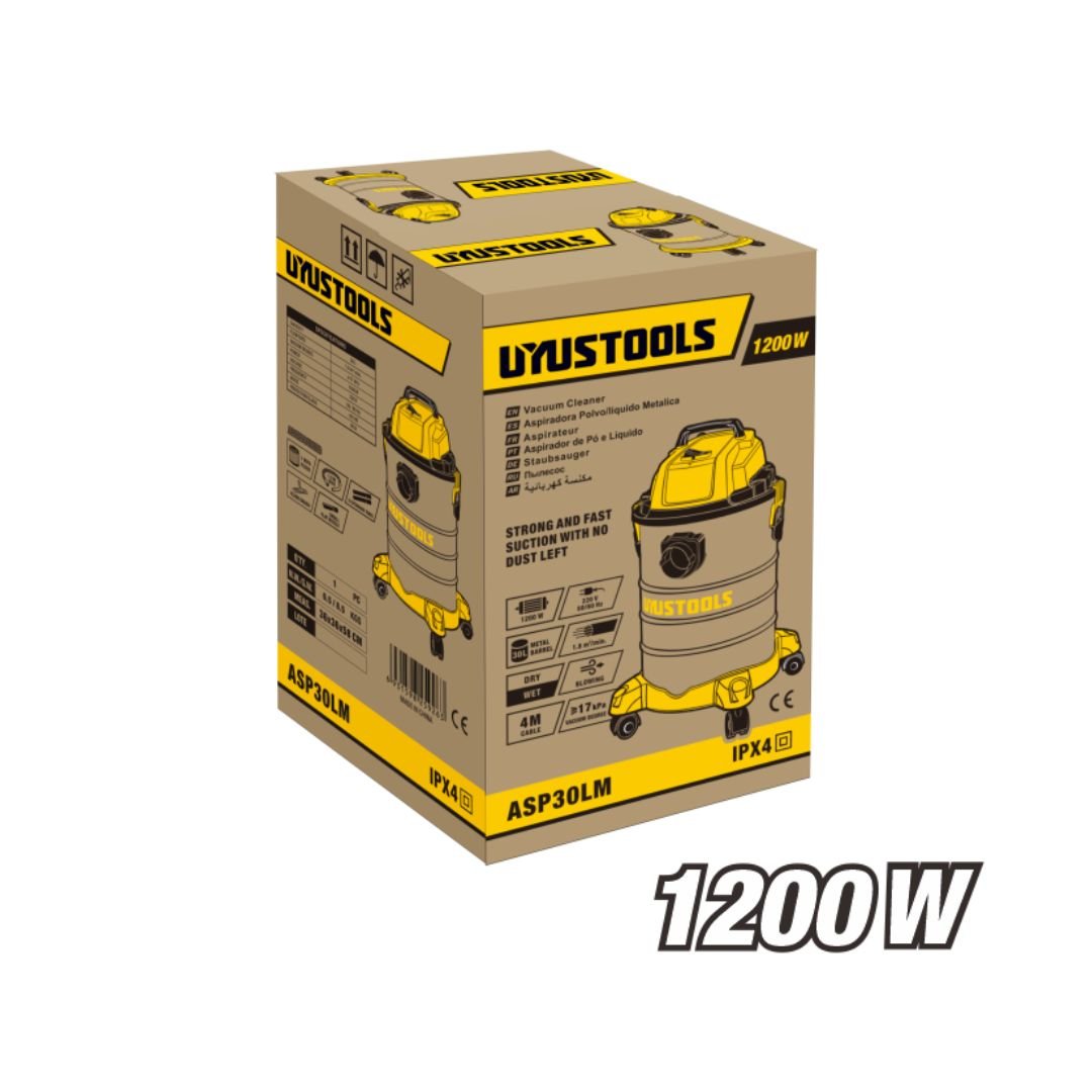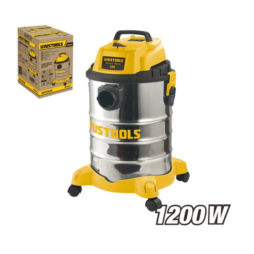 1200W 30L Vacuum Cleaner Model ARL-ASP30LM. This vacuum cleaner operates on 220-240V and 50/60 Hz with an input power of 1200W. It has a large dust capacity of 30L, a flow rate of 1.8m³/min, and a vacuum pressure of 17kPa. It comes with a 4m cable and a variety of accessories including a 1pc 1.5m hose, 2pcs plastic tubes, 1pc floor brush, 1pc small flat suction, 1pc paper bag, and 1pc sponge filter, as well as a HEPA filter.