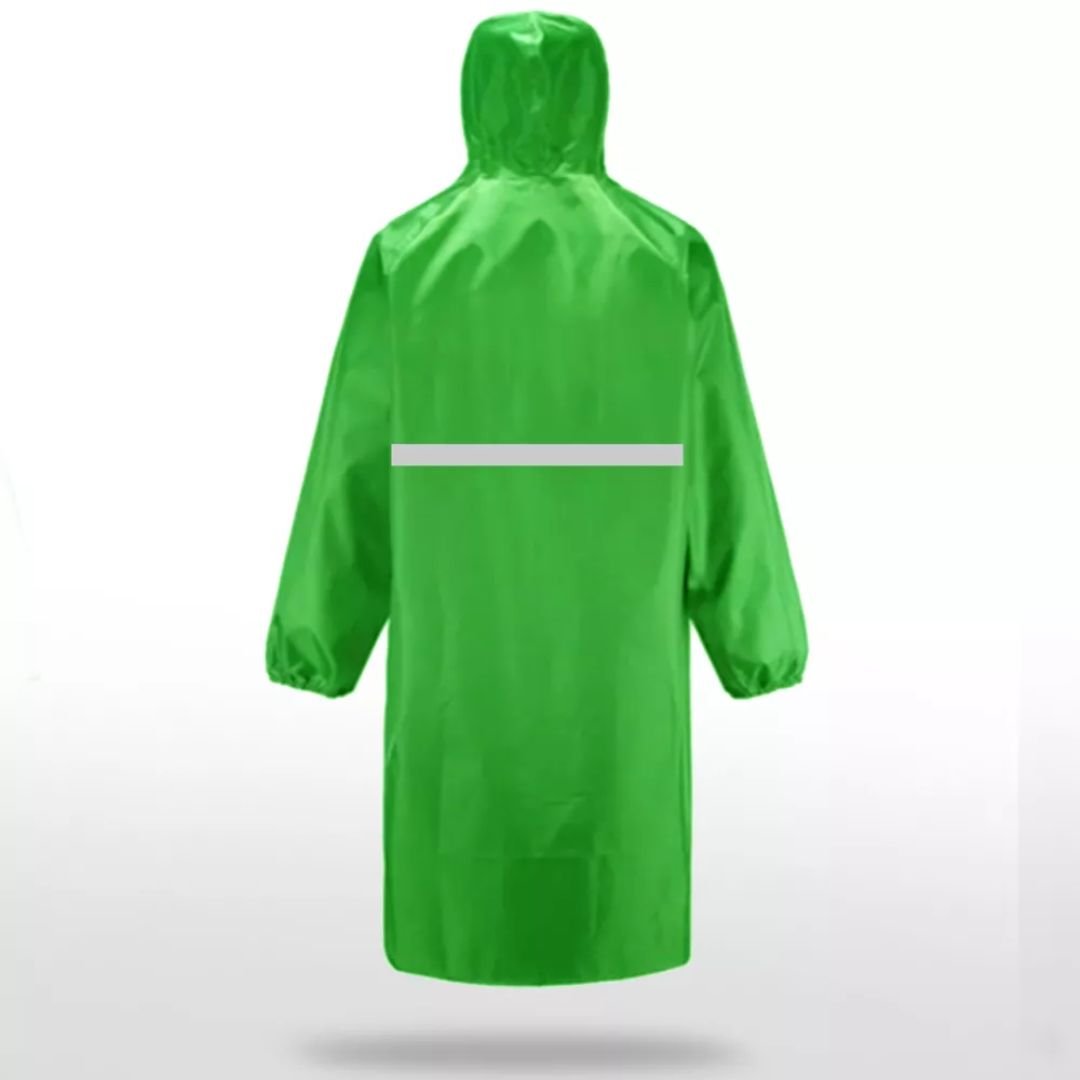 - Design: One piece Long rain coat(knee length), attached hood, wind proof strap with 4 or 5 snap buttons, long zipper, elastic insert cuff, one snap button on each border of sleeve. With two attached pockets. 2 cm width reflective tape.
