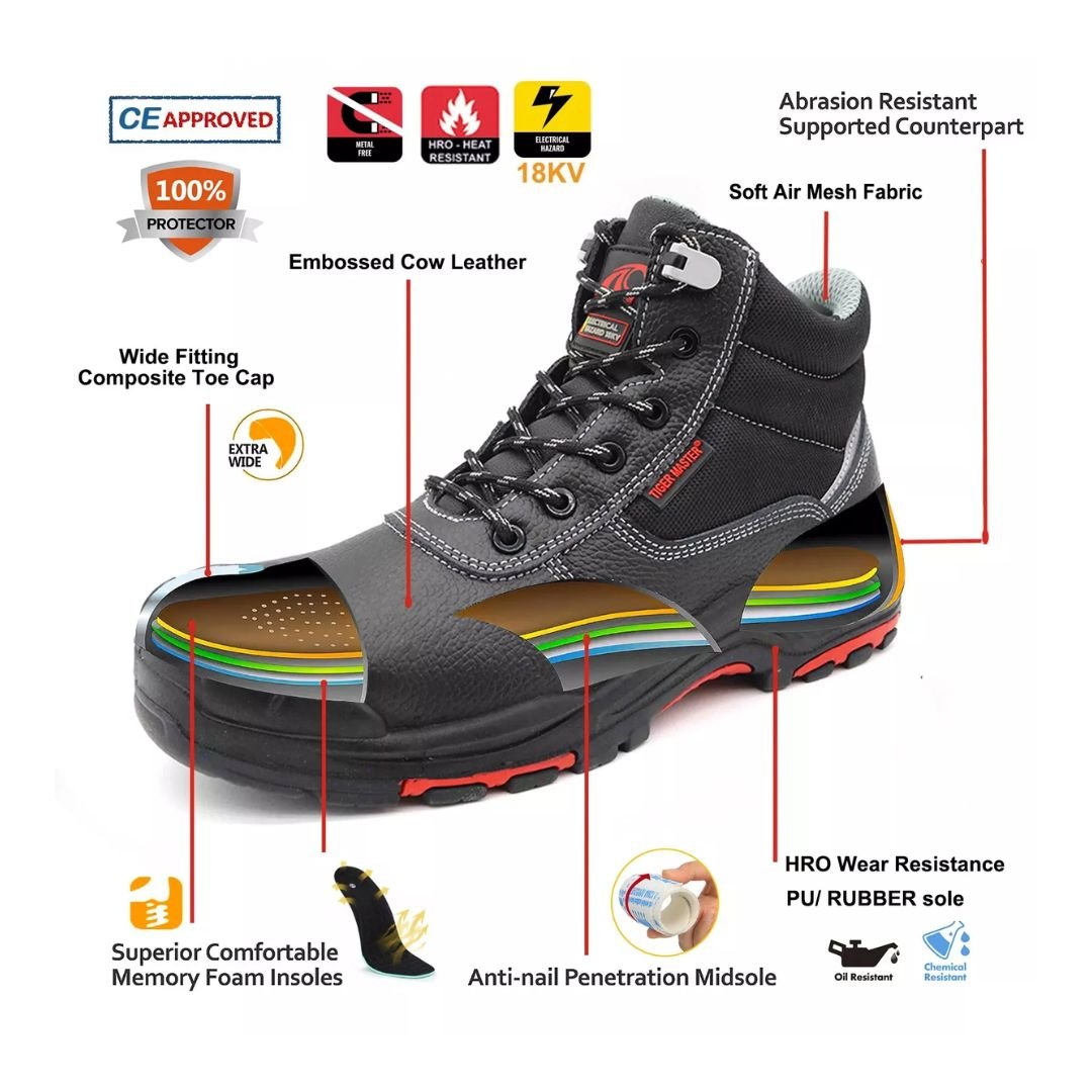 • Toe Cap: Fiberglass toe cap for impact resistance, meeting CE standards.