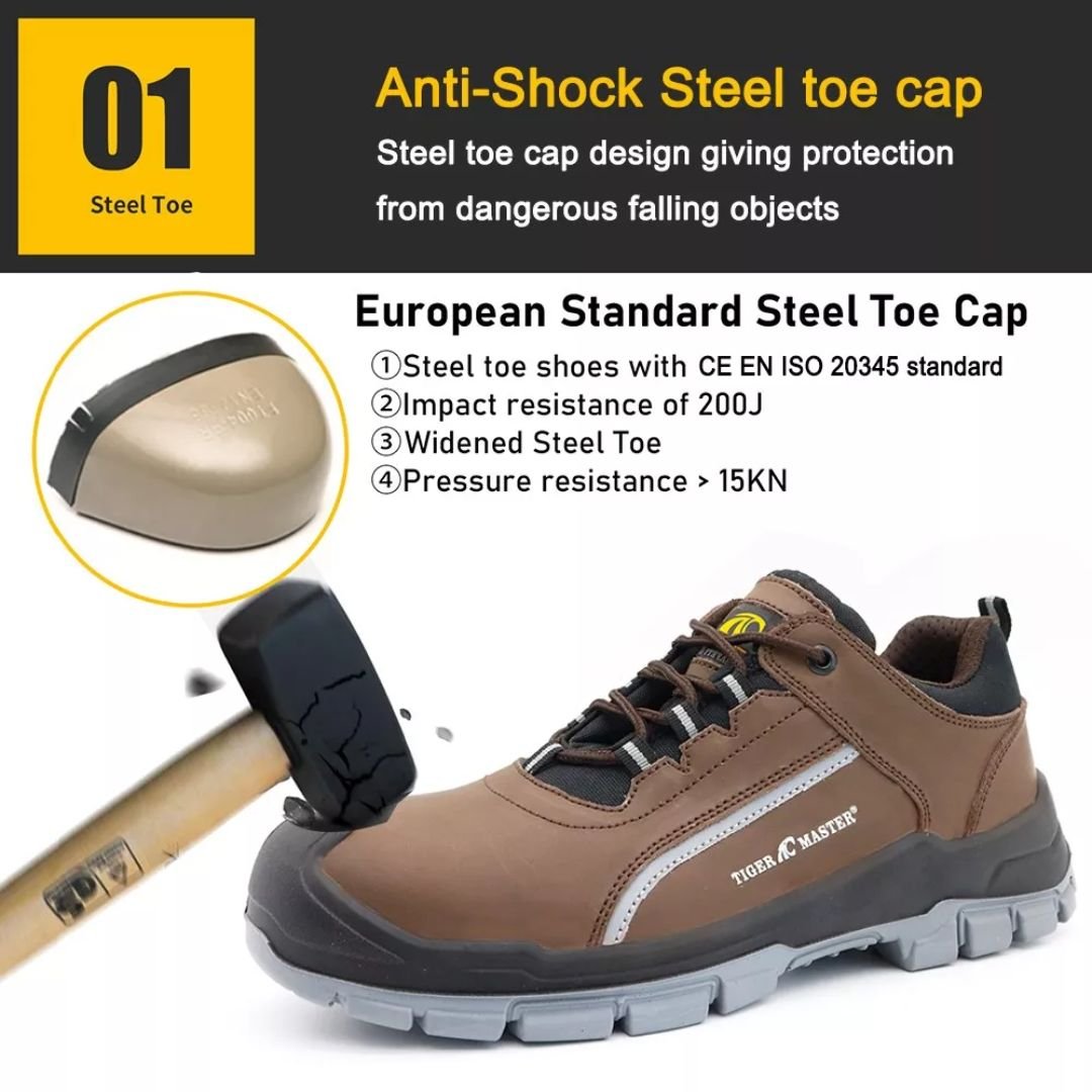 The 2024 New Anti-Puncture Brown Security Shoes Men ARL-TM181, injection-moulded, low-ankle safety footwear designed for various demanding work environments including construction sites, industrial settings, mining, warehouses, and general ground work. These shoes feature an upper made from corrected split cow leather, which is comfortable, highly flexible, breathable, and resistant to dust and wind. The PU dual-density sole is slip-resistant and meets CE EN ISO 20345:2022 Non-Slip Testing Standards, also offering resistance to oil, petrol, and chemicals. For comprehensive protection, the shoes include a 200-joule impact-resistant steel toe cap and an 1100-newton puncture-resistant steel midsole, both complying with CE EN ISO 20345 standards. A soft air mesh fabric lining and a removable metatomical EVA or HI-POLY footbed ensure long-lasting underfoot support and comfort. These shoes are also anti-static and provide shock absorption.