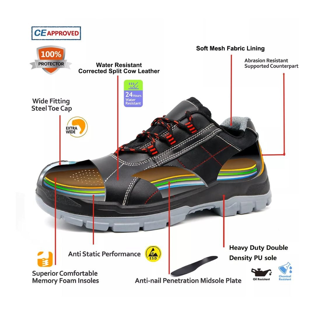 The 2025 New Black Leather Safety Anti-smashing Shoes Model TM188L ARL-TM188L are modern and robust low-cut safety footwear designed to provide essential protection in various work environments. Constructed with an injection-moulded method, these shoes feature an upper made from durable corrected split cow leather in a sleek black color. The sole is a dual-density PU, offering a balance of cushioning and excellent slip resistance. For enhanced comfort during long work hours, the lining is made of soft air mesh fabric, and the tongue and collar are made of high-density fabric for added support and comfort. These safety shoes are equipped with a steel toe cap that is impact-resistant up to 200 joules and a steel mid-plate that offers puncture resistance up to 1100 newtons, meeting CE EN ISO 20345 S3 SRC standards. They provide resistance against oil, petrol, water, slips, impact, and punctures, along with anti-static and shock absorption properties. These shoes are ideal for construction sites, industrial settings, mining, ground work, workshops, warehouses, logistics, super markets, and various other work environments where foot safety is crucial.