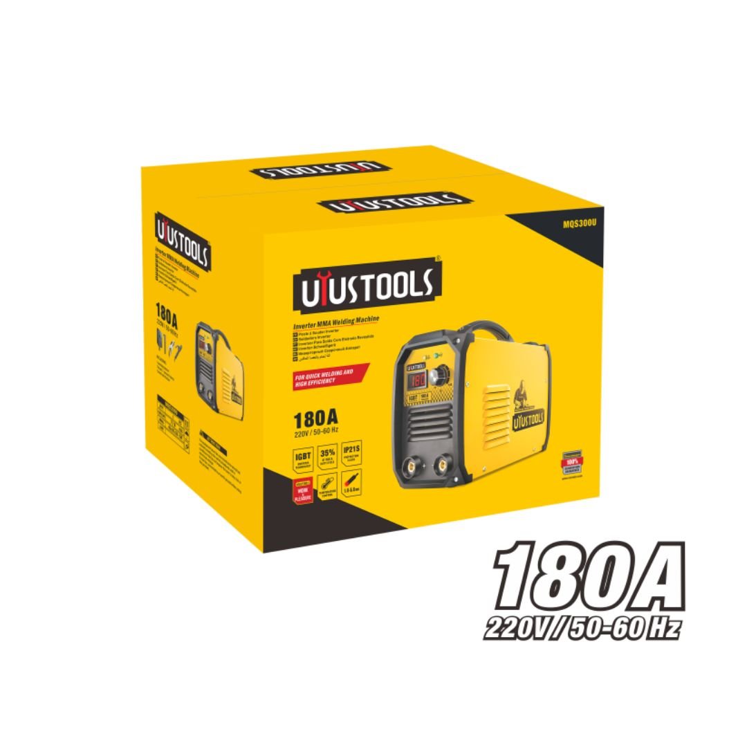 220V IGBT Inverter Electric Welder Model ARL-MQS300U. This welder utilizes IGBT inverter technology for efficient and stable performance. It operates on 220V at 50/60 Hz and features current regulation, a temperature warning system, and efficient ventilation and heat dissipation. It has a maximum open circuit voltage of 65V and an efficiency of 85% with a power rating of 7.7 KVA. The weld current range is 20 – 180A with a duty cycle of 35% at 180A. It is suitable for electrode diameters of 1.0 – 5.0 mm, has an insulation class F, and a protection class of IP21S. Accessories include 1 welding helmet, 1 brush, 1 ground clamp, and 1 electrode holder.