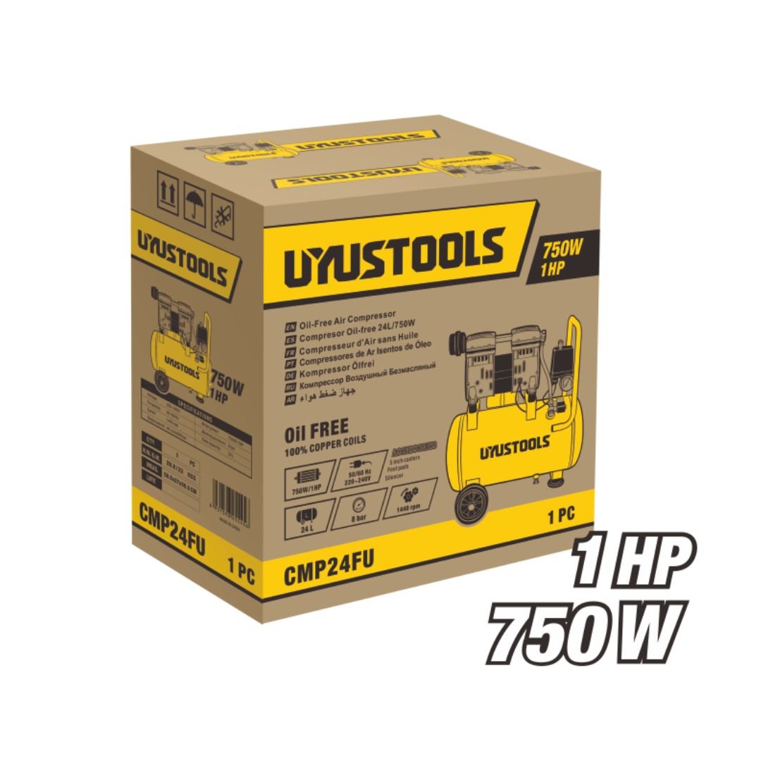 24L 1HP Oil-free Air Compressor with Silencer Model ARL-CMP24FU. This oil-free compressor operates on 220-240V at 50/60 Hz with a motor power of 750W (1 HP). It features 100% copper coils for enhanced durability and efficiency. It has a displacement of 46 L/min at 8 bar working pressure and a 24L tank capacity. The compressor runs at a speed of 1440 rpm and is equipped with a silencer for a quieter working environment. It also comes with 5-inch coasters and foot pads for portability and stability.