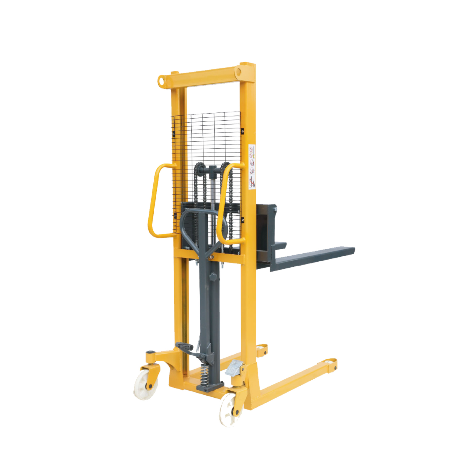 The stacker is designed with a reinforced steel mast and includes a foot brake system to lock the unit in position, providing the necessary stability for safe high-level lifting.