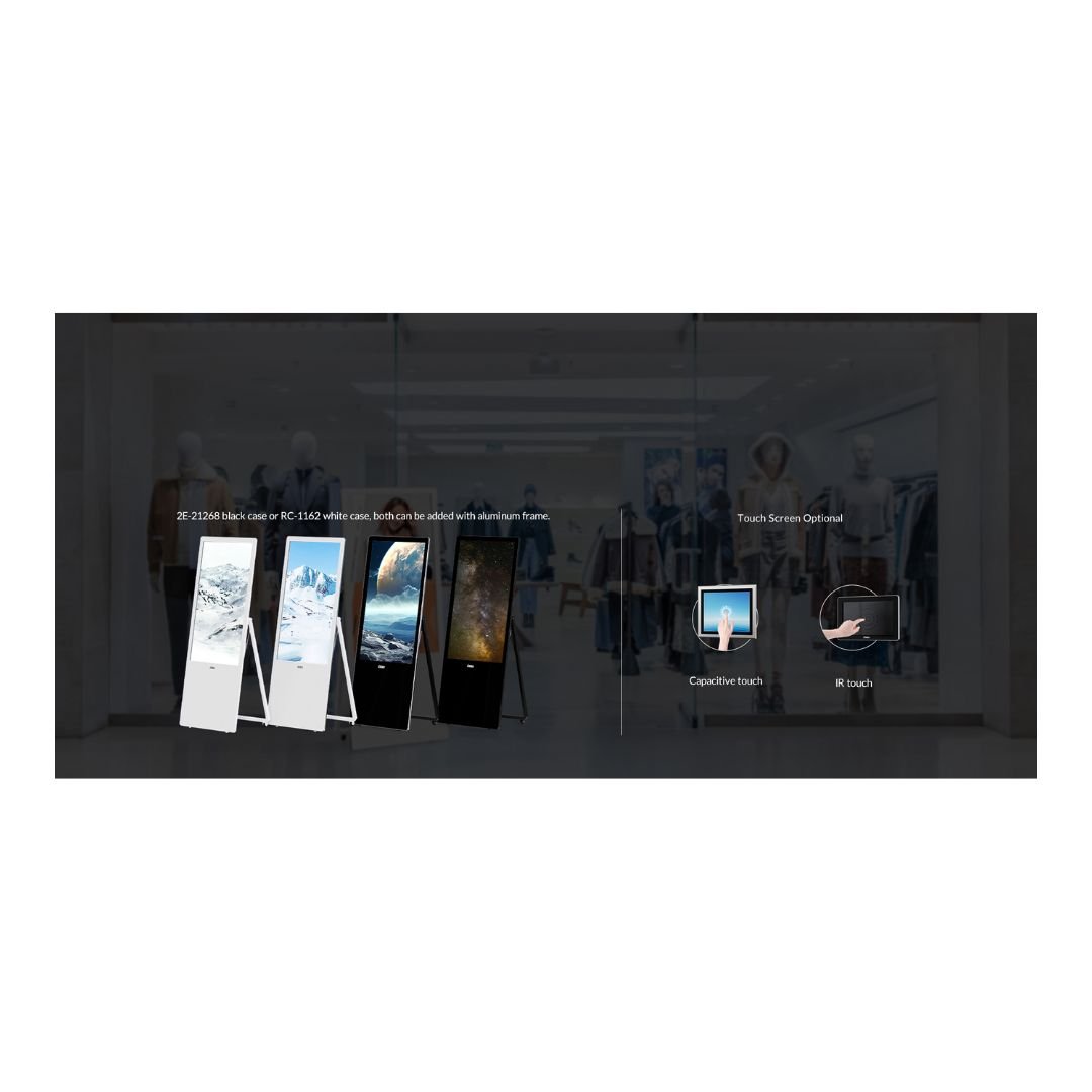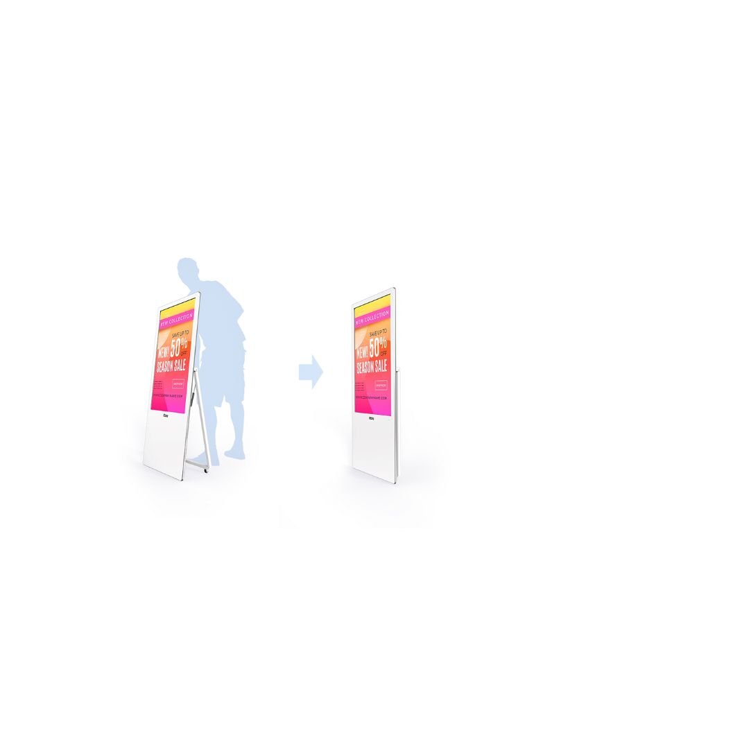 The 43 inch Digital Poster Display ARL-RCS-430LA offers a sleek, ultra-slim 38mm design, making it an exquisite and lightweight solution for various indoor environments. It features a foldable stand with rollers for effortless movement and comes with an optional black or white metal shell, both accented by a stylish silver aluminum frame. This versatile display supports Android, Windows, Monitor, or Plug-and-Play operating systems, with free CMS addition and compatibility with third-party software. With a 1080×1920 FHD display and optional brightness from 500-3500 nits (default 500 nits), it delivers immersive picture quality indoors.
