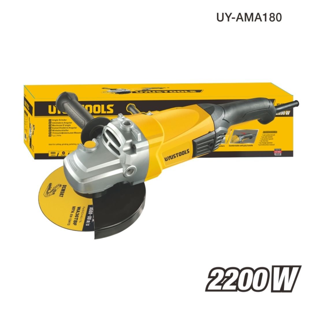 The Angle Grinder ARL-UY-AMA180 is a robust tool engineered for high work efficiency, driven by its powerful 2200W motor. It operates on a versatile rated voltage of 110-120V/220-240V and a frequency of 50/60 Hz. This angle grinder is designed for use with 180mm diameter discs and features a no-load speed of 8000r/min. It is equipped with an auxiliary handle for comfortable and secure holding, along with a spindle lock to facilitate quick and easy accessory changes. The high-efficiency heat dissipation system ensures the protection of the fuselage during demanding tasks. The comfortable soft grip handle enhances user comfort, and the grille-type air intake with an open air duct optimizes cooling.