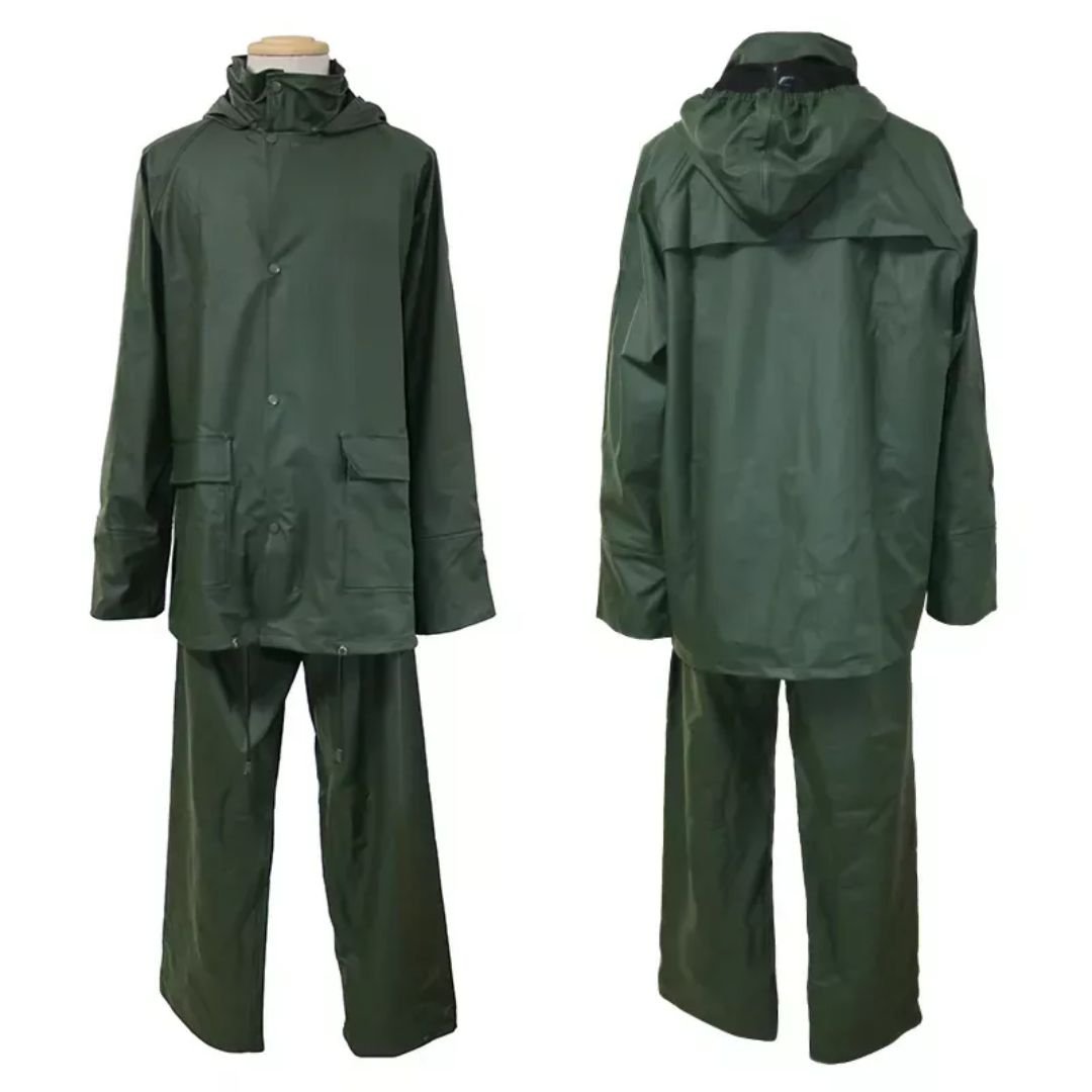 The Army Green Waterproof Oil Resistant PU Rain coat for Men ARL-RT17 is a heavy-duty and protective rainwear set designed for men working in demanding environments such as industrial sites, construction, oil and chemical industries, power plants, oil rigs, shipping, mining, and more. Made from PU coating with PVC, this set includes a jacket with an attached hood with drawstring, raglan shoulder design with underarm vents, a front closure with 4 snaps and a long inner zipper, elastic insert cuffs, and two large pockets. The basic wide-leg trousers feature an elastic waist. With seams sealed using high-frequency welding, this unlined set offers 100% waterproof, oil, chemical resistant, windproof, and wrinkle-free properties. Reflective tape is also available for enhanced visibility.