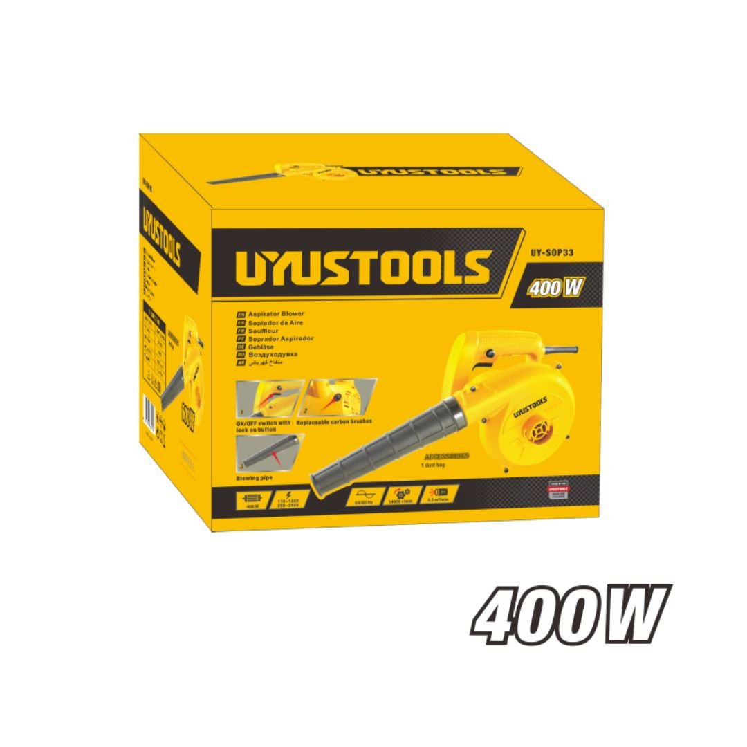 Aspirator Blower Model ARL-UY-SOP33. This blower features an on/off switch with a lock-on button for continuous operation and replaceable carbon brushes for extended motor life.