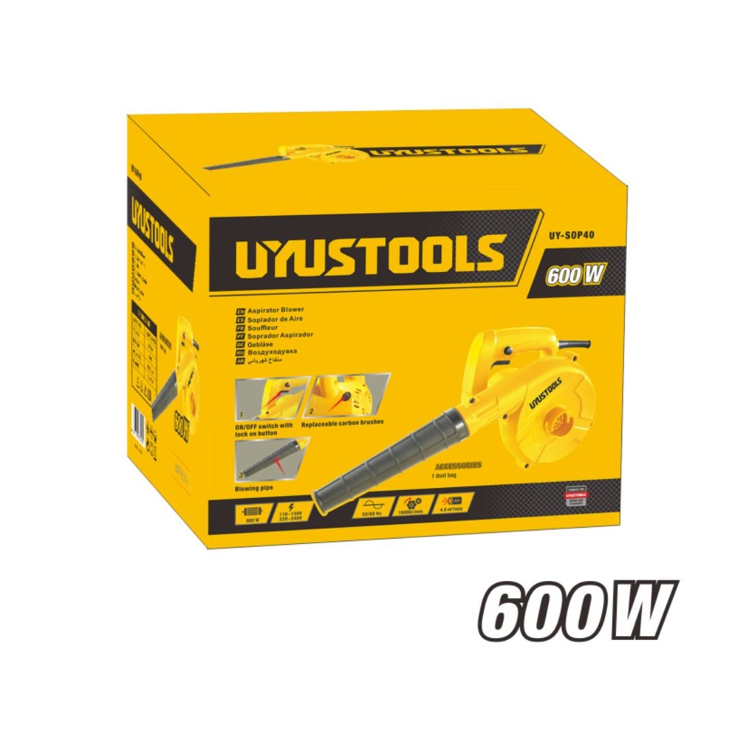 Aspirator Blower Model ARL-UY-SOP40. This blower features an on/off switch with a lock-on button for continuous operation and replaceable carbon brushes for extended motor life.