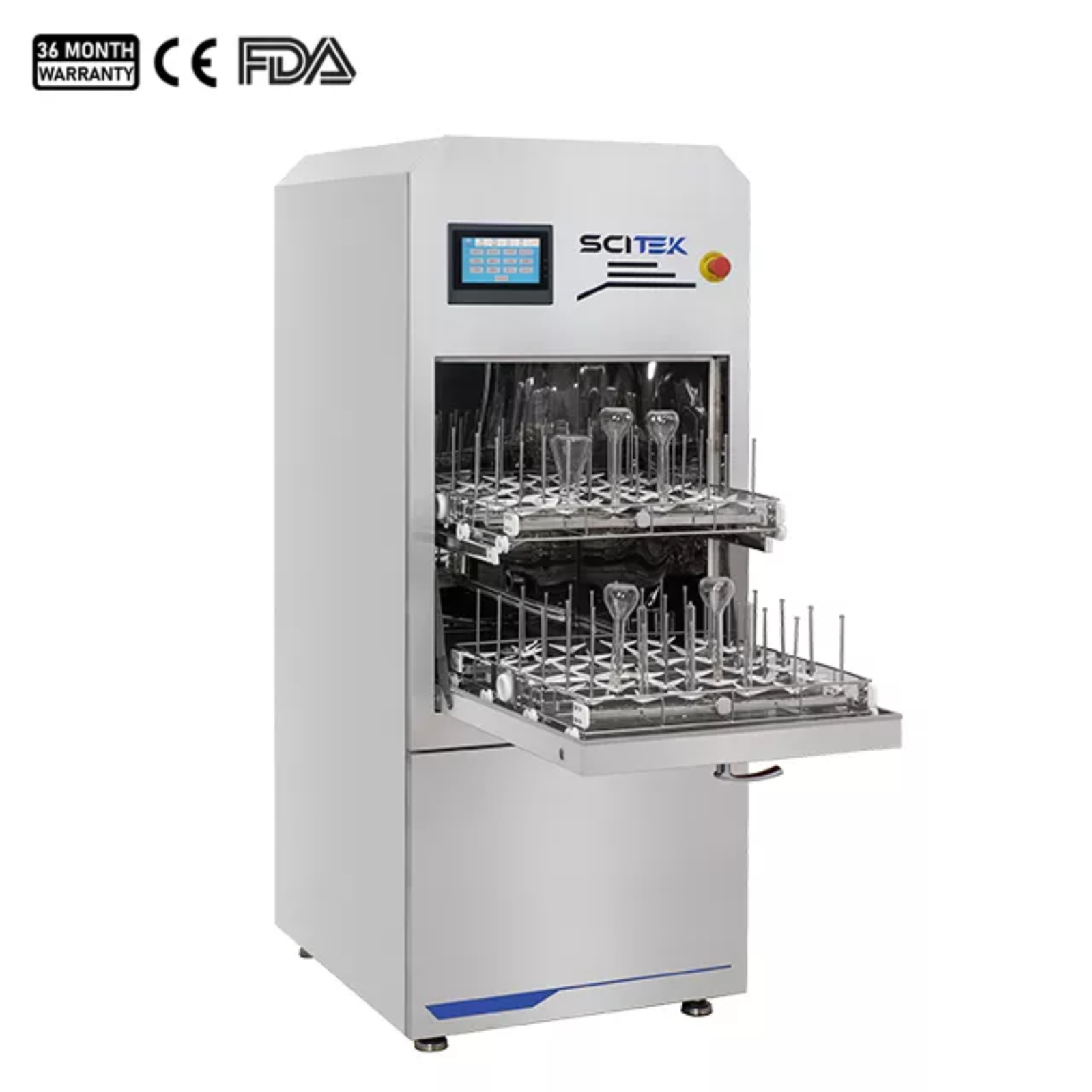 Ultra-slim laboratory glassware washer with compact dimensions and large capacity.