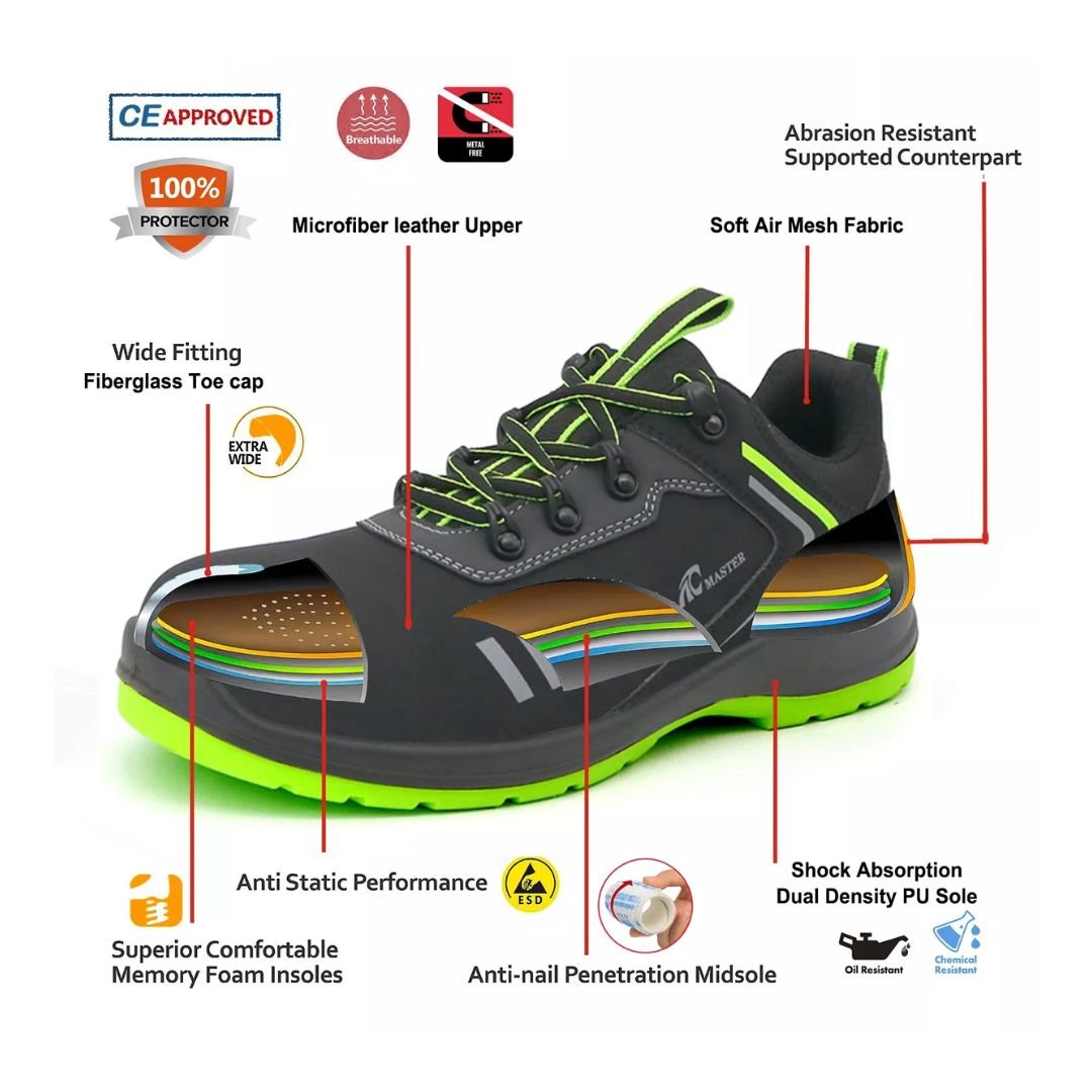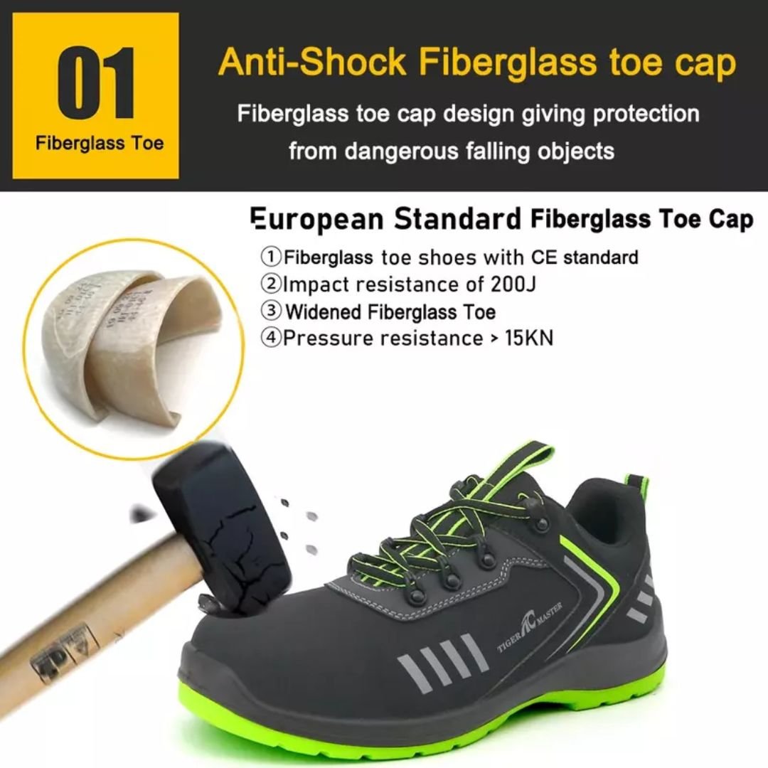 - Toe Cap: Fiberglass toe cap for impact resistance, meeting CE standards.