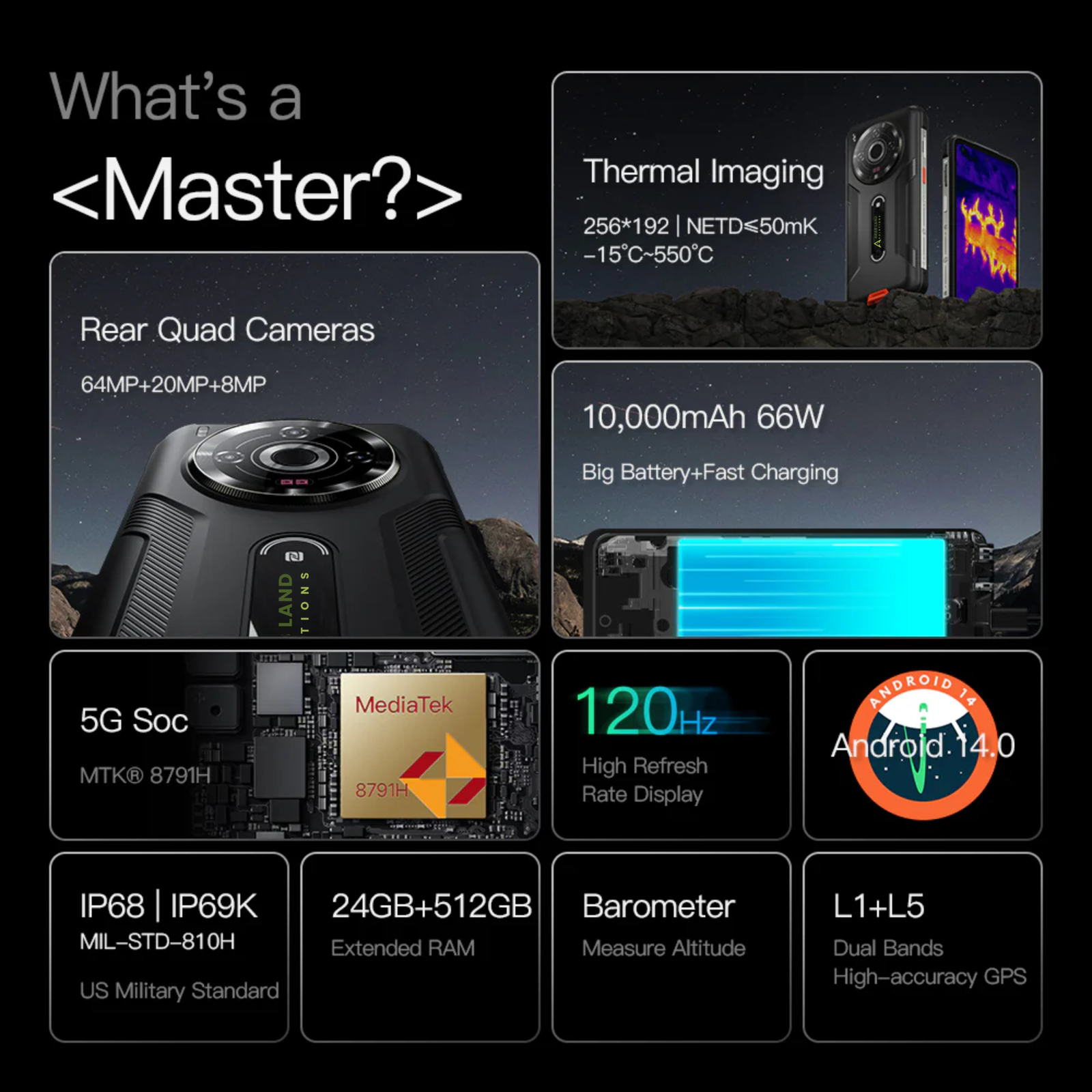 Product Description: The Flagship Thermal Imaging Rugged Phone ARL-P20 Pro is a high-end rugged smartphone designed for professionals and enthusiasts who demand top-tier performance and advanced features. It boasts a powerful MT6877/5G 6nm octa-core processor, 8GB of RAM, and a massive 512GB of storage, running on the latest Android 14 OS. The 6.6-inch FHD+ IPS display offers a stunning visual experience. The ARL-P20 Pro features a versatile camera setup, including a 64MP+8MP (123° wide angle) rear camera with a 20MP night vision lens, and a 32MP front camera. Notably, it includes a dedicated 20MP night vision camera and a thermal imaging camera (256*192). With IP68/IP69K water and dust resistance, it’s built to withstand the harshest conditions. The 10000mAh battery ensures extended usage, and features like NFC, fingerprint unlock, GPS (with multiple satellite systems), and a programmable PTT button enhance its functionality.