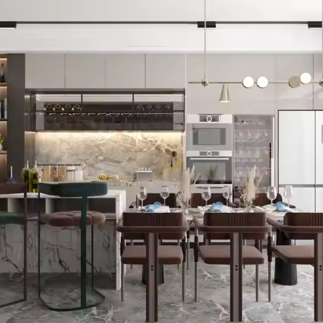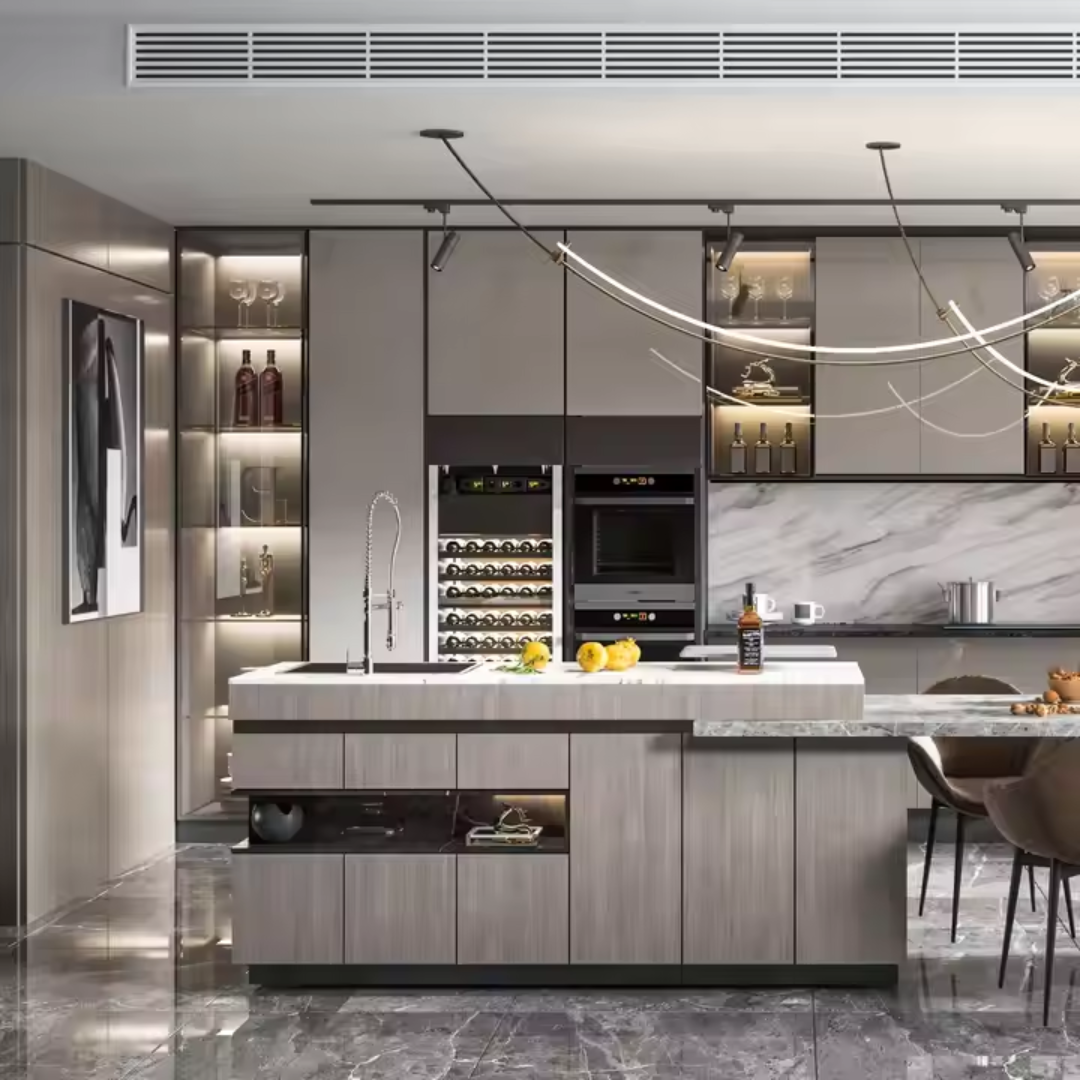 Handleless Light Gray Glossy Storage Cabinets – Modern Kitchen Furniture Design. The Handleless Light Gray Glossy Storage Cabinets offer a sleek and sophisticated solution for modern kitchens, especially well-suited for villas. This modular system features a contemporary handleless design with a luminous light gray glossy finish, providing extensive storage and a streamlined aesthetic. Constructed from durable MDF, melamine board, particleboard, and plywood, with various door panel surface treatment options including Acrylic, Lacquer, and PVC Membrane, these cabinets are both visually appealing and built to last. With a focus on environmental friendliness and a lifetime warranty, this collection ensures a functional and elegant culinary space.