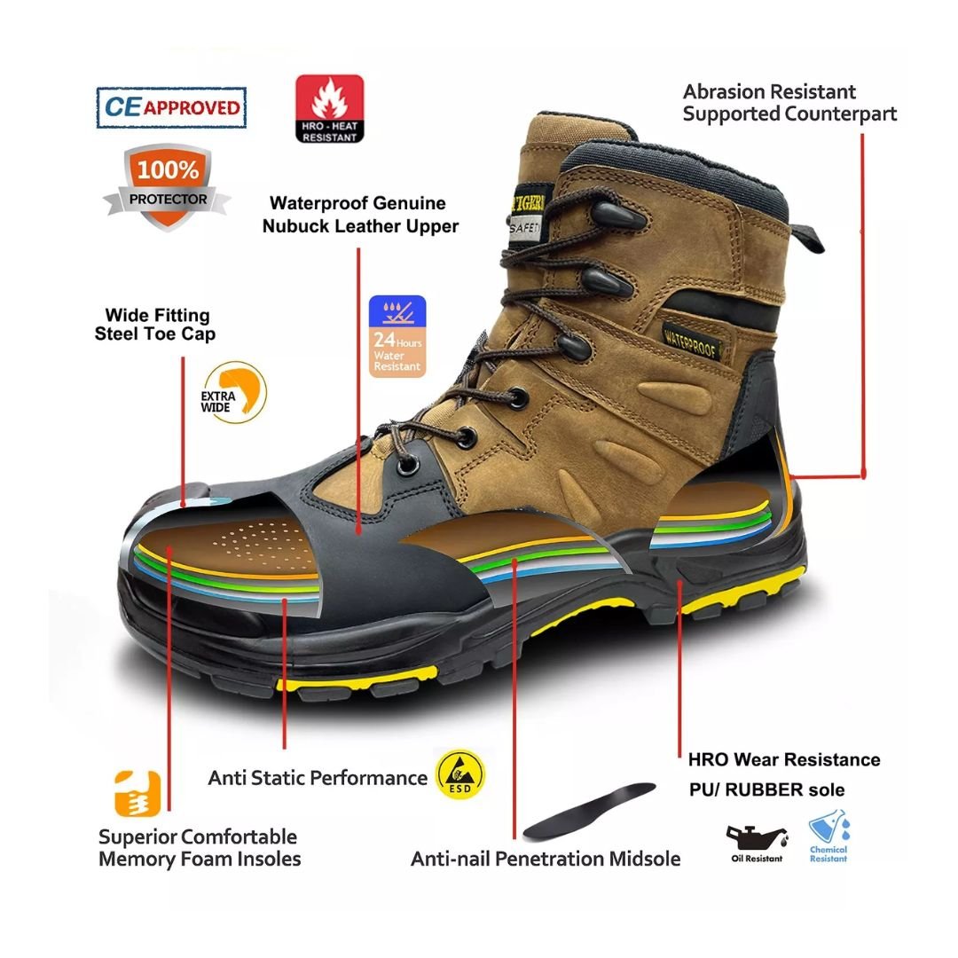 The High-Quality HRO Safety Boots ARL-TM134 are injection-moulded safety footwear designed for demanding environments such as construction sites, industrial settings, oil fields, and mining operations. These boots feature a genuine nubuck leather upper for comfort, flexibility, and resistance to dust and wind. The dual-density PU and rubber sole is slip-resistant, meets CE EN ISO 20345:2022 Non-Slip Testing Standards, and offers HRO (Heat Resistant Outsole) properties, resisting heat up to 300°C. For comprehensive protection, the boots include a 200-joule impact-resistant steel toe cap and an 1100-newton puncture-resistant steel midsole, both complying with CE EN ISO 20345 standards. A soft air mesh fabric lining and a removable HI-POLY footbed ensure long-lasting underfoot support and comfort. These boots are also oil/petrol/chemical resistant, anti-static, and provide shock absorption.