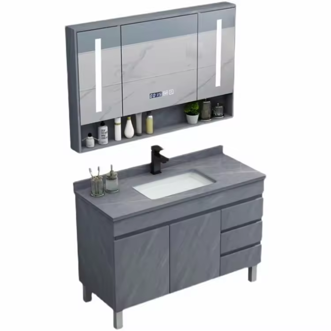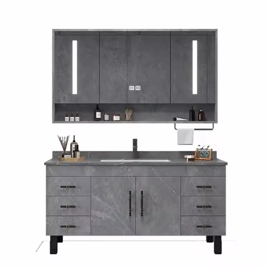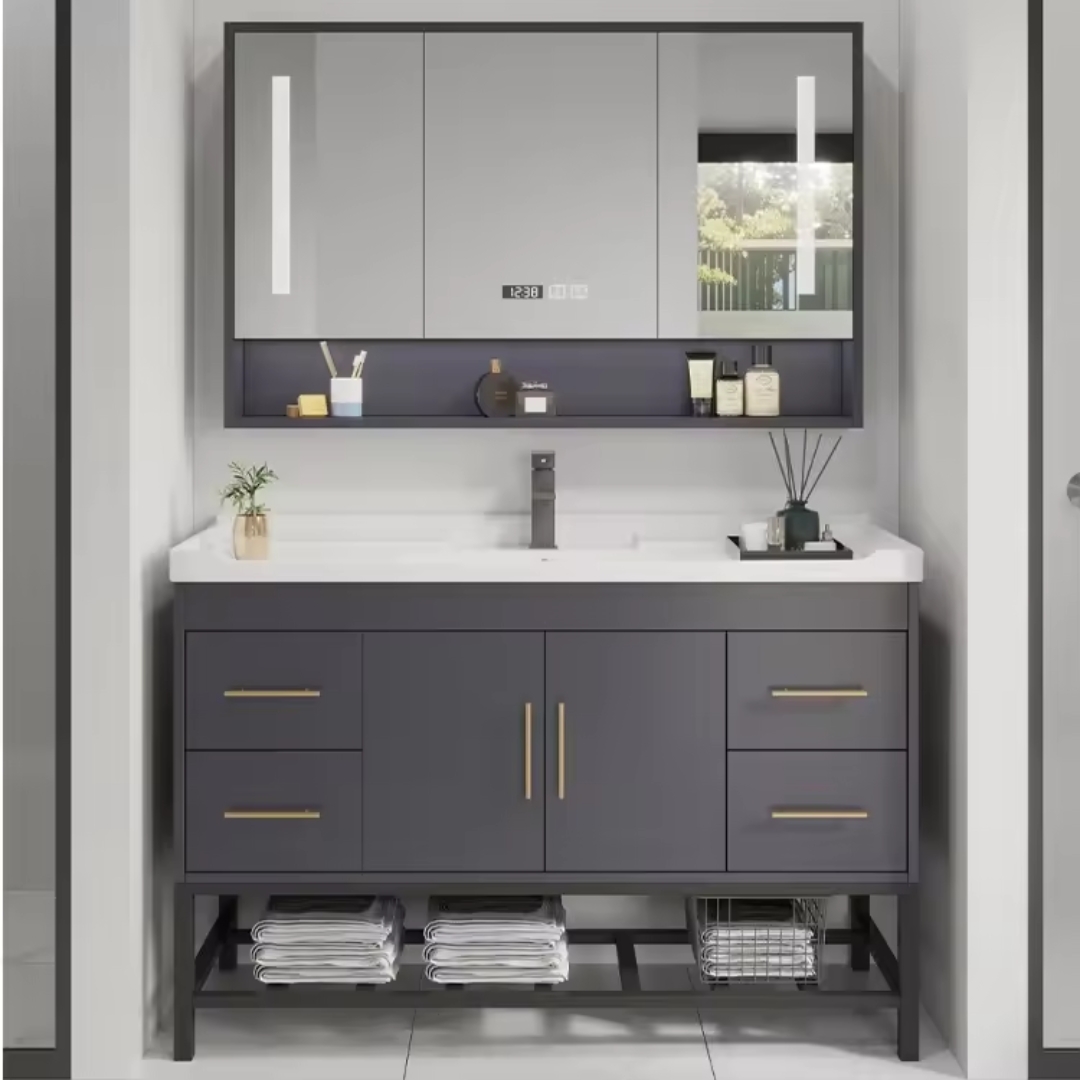Luxury Modern Unassembled Bathroom Vanity Set. The offers a high-end, unassembled bathroom vanity set that blends luxury with modern design, making it an ideal choice for hotels and upscale residential applications. This set provides a comprehensive solution, including a cabinet, basin, and an advanced LED touch-illuminated mirror. Crafted primarily from durable Melamine MDF + Particleboard, it ensures longevity and a refined aesthetic. Being unassembled, it offers advantages such as reduced shipping costs and easier handling, with a design for straightforward setup.
