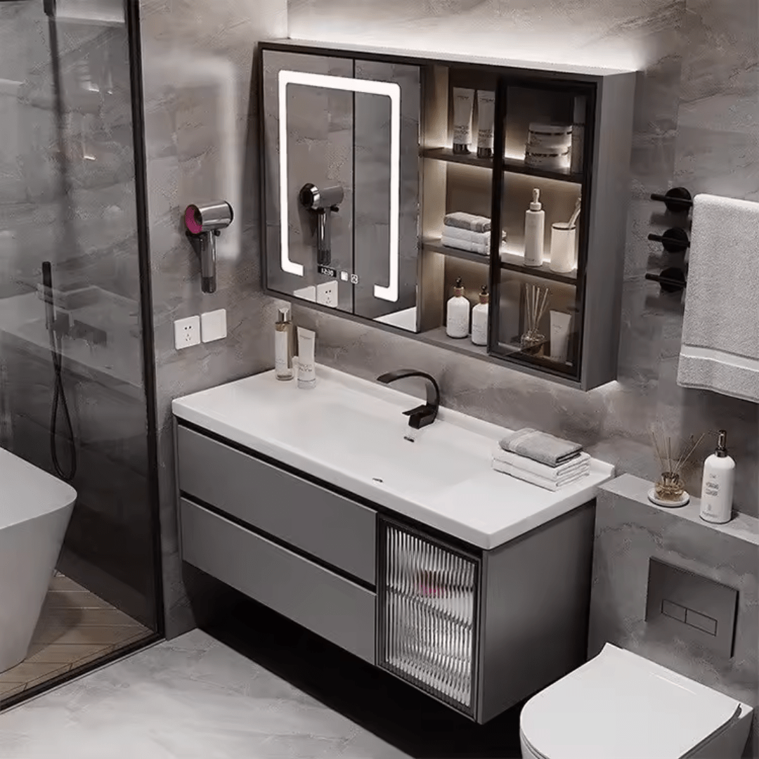 - Integrated Mirrored Cabinet: Offers convenient storage and an LED touch-illuminated mirror for enhanced grooming.