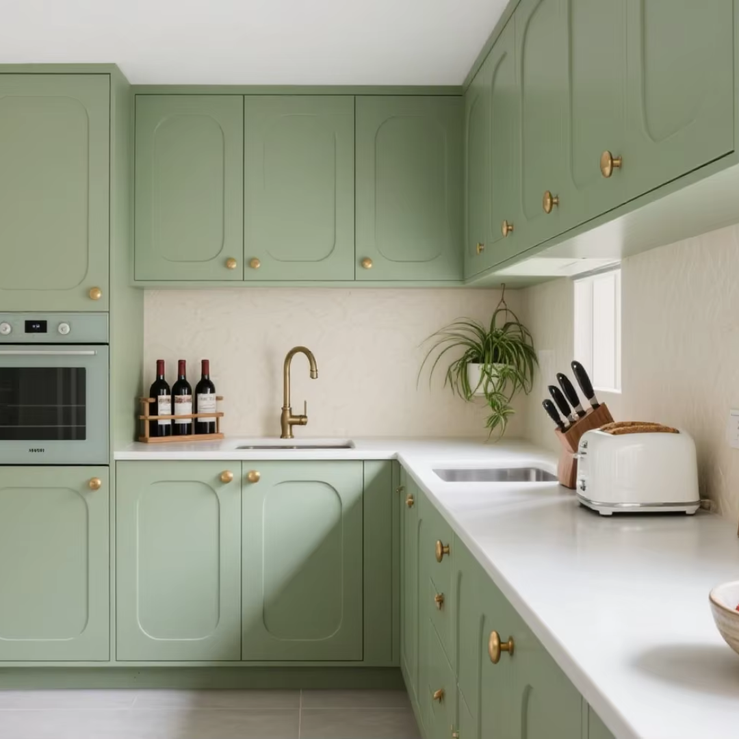 - Modern style modular kitchen cabinets with a refreshing green finish.