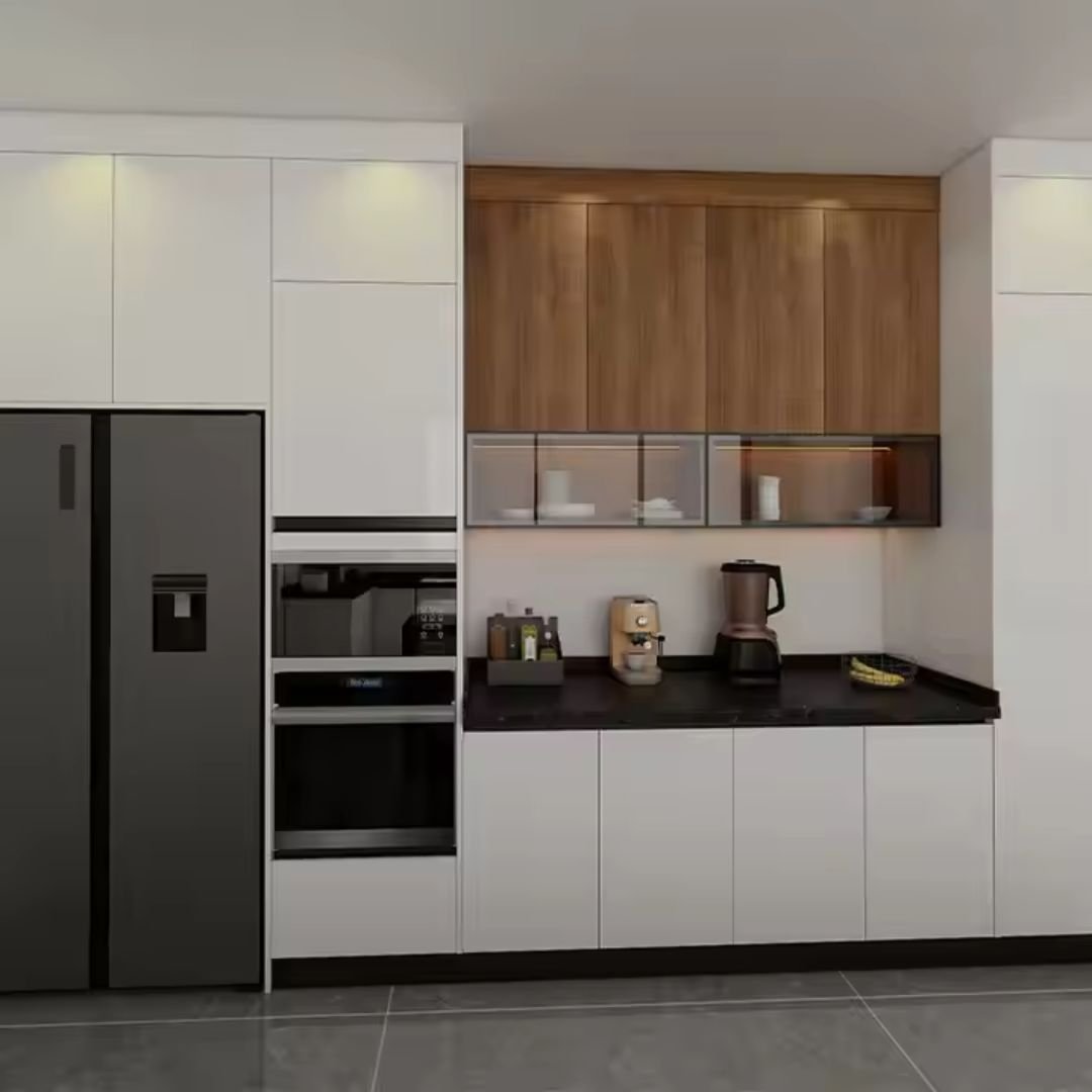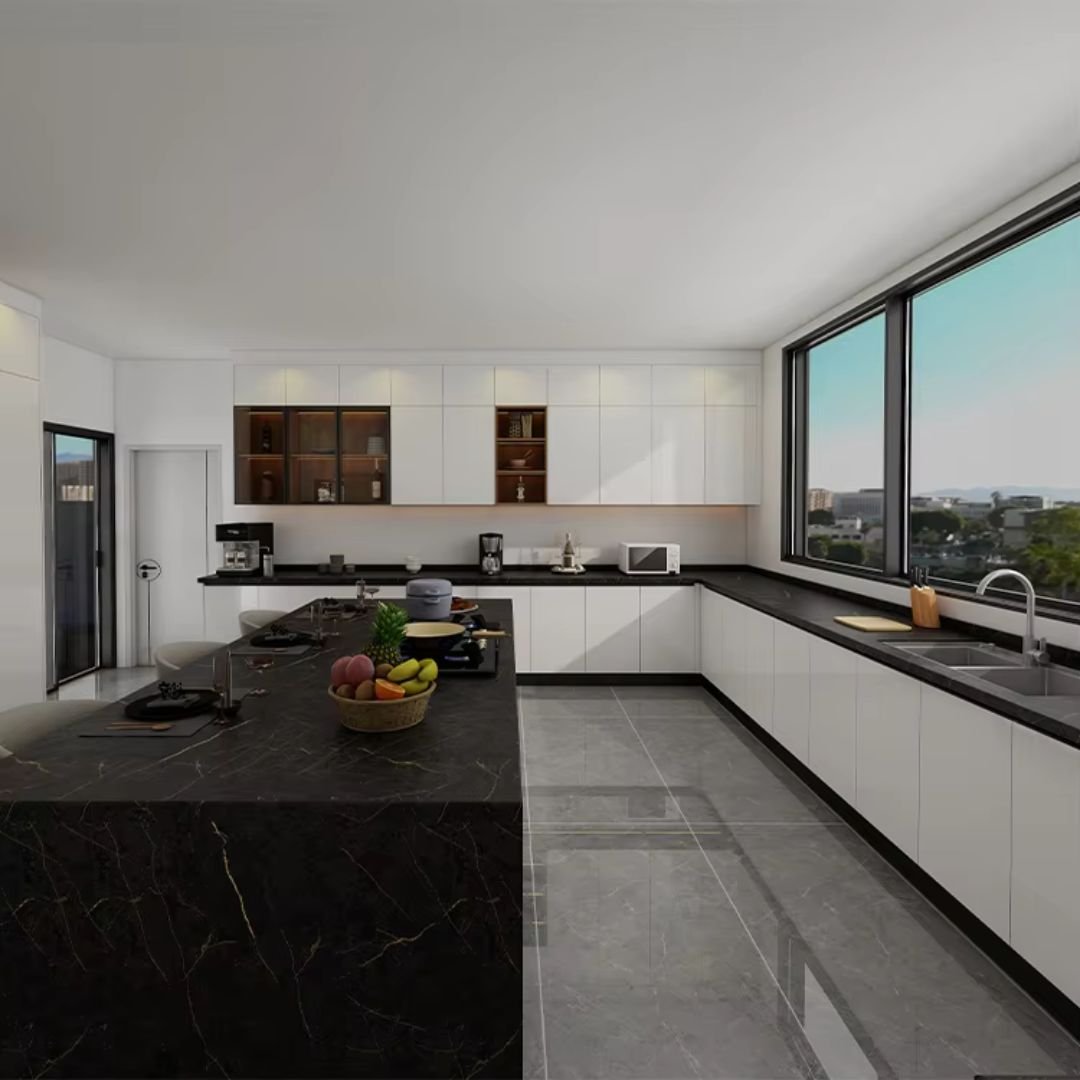 Modern Style Modular Kitchen Island ARL-SPK25062710. The ARL-SPK25062710 presents a modern and highly functional modular kitchen island, designed to be a centerpiece in villas and contemporary homes. This island features a durable particleboard carcase and a sleek artificial quartz countertop, complemented by MDF and plywood door materials with PVC membrane surface treatment. With its built-in storage solutions and a focus on environmental friendliness, this kitchen island offers a blend of aesthetic appeal, practical utility, and quality craftsmanship, backed by a 5-year warranty and comprehensive support.
